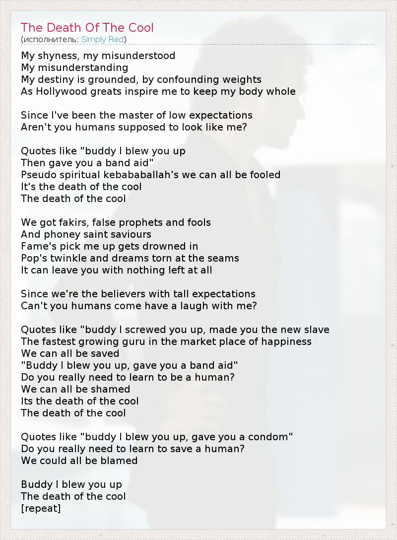 My shyness, my misunderstood My misunderstanding My destiny is grounded, by confounding weights As Hollywood greats inspire me to keep my body whole Since I've been the master of low expectations Aren't you humans supposed to look like me? Quotes like "buddy I blew you up Then gave you a band aid" Pseudo spiritual kebababallah's we can all be fooled It's the death of the cool The death of the cool We got fakirs, false prophets and fools And phoney saint saviours Fame's pick me up gets drowned in Pop's twinkle and dreams torn at the seams It can leave you with nothing left at all Since we're the believers with tall expectations Can't you humans come have a laugh with me? Quotes like "buddy I screwed you up, made you the new slave The fastest growing guru in the market place of happiness We can all be saved "Buddy I blew you up, gave you a band aid" Do you really need to learn to be a human? We can all be shamed Its the death of the cool The death of the cool Quotes like "buddy I blew you up, gave you a condom" Do you really need to learn to save a human? We could all be blamed Buddy I blew you up The death of the cool [repeat]