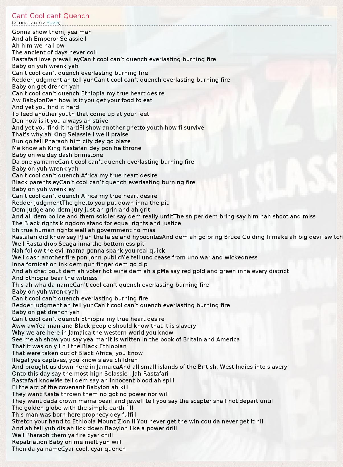 Gonna show them, yea man And ah Emperor Selassie I Ah him we hail ow The ancient of days never coil Rastafari love prevail eyCan't cool can't quench everlasting burning fire Babylon yuh wrenk yah Can't cool can't quench everlasting burning fire Redder judgment ah tell yuhCan't cool can't quench everlasting burning fire Babylon get drench yah Can't cool can't quench Ethiopia my true heart desire Aw BabylonDen how is it you get your food to eat And yet you find it hard To feed another youth that come up at your feet Den how is it you always ah strive And yet you find it hardFi show another ghetto youth how fi survive That's why ah King Selassie I we'll praise Run go tell Pharaoh him city dey go blaze Me know ah King Rastafari dey pon he throne Babylon we dey dash brimstone Da one ya nameCan't cool can't quench everlasting burning fire Babylon yuh wrenk yah Can't cool can't quench Africa my true heart desire Black parents eyCan't cool can't quench everlasting burning fire Babylon yuh wrenk ey Can't cool can't quench Africa my true heart desire Redder judgmentThe ghetto you put down inna the pit Dem judge and dem jury just ah grin and ah grit And all dem police and them soldier say dem really unfitThe sniper dem bring say him nah shoot and miss The Black rights kingdom stand for equal rights and justice Eh true human rights well ah government no miss Rastafari did know say PJ ah the false and hypocritesAnd dem ah go bring Bruce Golding fi make ah big devil switch Well Rasta drop Seaga inna the bottomless pit Nah follow the evil mama gonna spank you real quick Well dash another fire pon John publicMe tell uno cease from uno war and wickedness Inna fornication ink dem gun finger dem go dip And ah chat bout dem ah voter hot wine dem ah sipMe say red gold and green inna every district And Ethiopia bear the witness This ah wha da nameCan't cool can't quench everlasting burning fire Babylon yuh wrenk yah Can't cool can't quench everlasting burning fire Redder judgment ah tell yuhCan't cool can't quench everlasting burning fire Babylon get drench yah Can't cool can't quench Ethiopia my true heart desire Aww awYea man and Black people should know that it is slavery Why we are here in Jamaica the western world you know See me ah show you say yea manIt is written in the book of Britain and America That it was only I n I the Black Ethiopian That were taken out of Black Africa, you know Illegal yes captives, you know slave children And brought us down here in JamaicaAnd all small islands of the British, West Indies into slavery Onto this day say the most high Selassie I Jah Rastafari Rastafari knowMe tell dem say ah innocent blood ah spill Fi the arc of the covenant Babylon ah kill They want Rasta thrown them no got no power nor will They want dada crown mama pearl and jewelI tell you say the scepter shall not depart until The golden globe with the simple earth fill This man was born here prophecy dey fulfill Stretch your hand to Ethiopia Mount Zion illYou never get the win coulda never get it nil And ah tell yuh dis ah lick down Babylon like a power drill Well Pharaoh them ya fire cyar chill Repatriation Babylon me melt yuh will Then da ya nameCyar cool, cyar quench