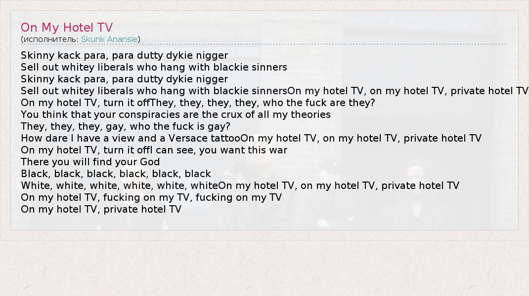 Sell out whitey liberals who hang with blackie sinnersOn my hotel TV, on my hotel TV, private hotel TV