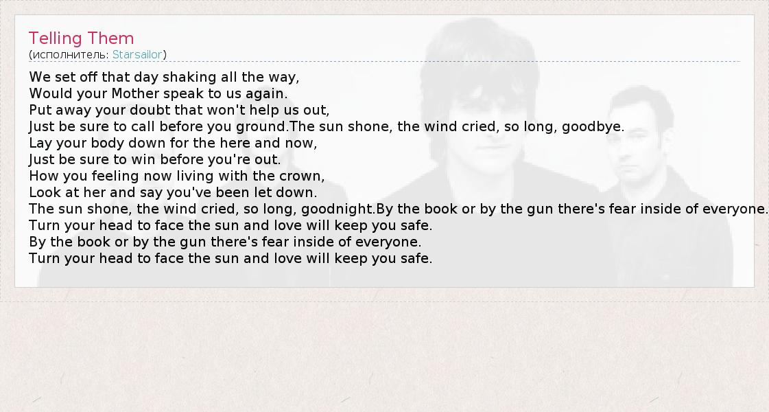 Это интересно:Starsailor (в переводе с англ. — «Звёздный странник») — английская рок-группа, основанная в Уиган, графство Большой Манчестер, Англия. На 2009-й год группа выпустила четыре студийных альбома. Двенадцать из тринадцати синглов попали в официальный хит-парад синглов Великобритании, также группа продала около 3 млн. копий своих записей. В ноябре 2009 года группа объявила о бессрочном отпуске, одновременно... продолжение