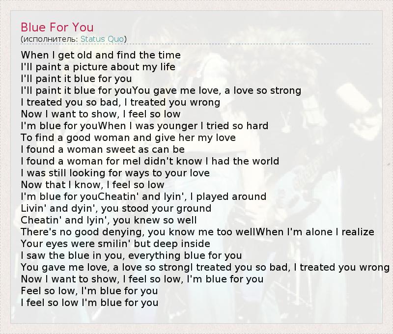 When I get old and find the time I'll paint a picture about my life I'll paint it blue for you I'll paint it blue for youYou gave me love, a love so strong I treated you so bad, I treated you wrong Now I want to show, I feel so low I'm blue for youWhen I was younger I tried so hard To find a good woman and give her my love I found a woman sweet as can be I found a woman for meI didn't know I had the world I was still looking for ways to your love Now that I know, I feel so low I'm blue for youCheatin' and lyin', I played around Livin' and dyin', you stood your ground Cheatin' and lyin', you knew so well There's no good denying, you know me too wellWhen I'm alone I realize Your eyes were smilin' but deep inside I saw the blue in you, everything blue for you You gave me love, a love so strongI treated you so bad, I treated you wrong Now I want to show, I feel so low, I'm blue for you Feel so low, I'm blue for you I feel so low I'm blue for you