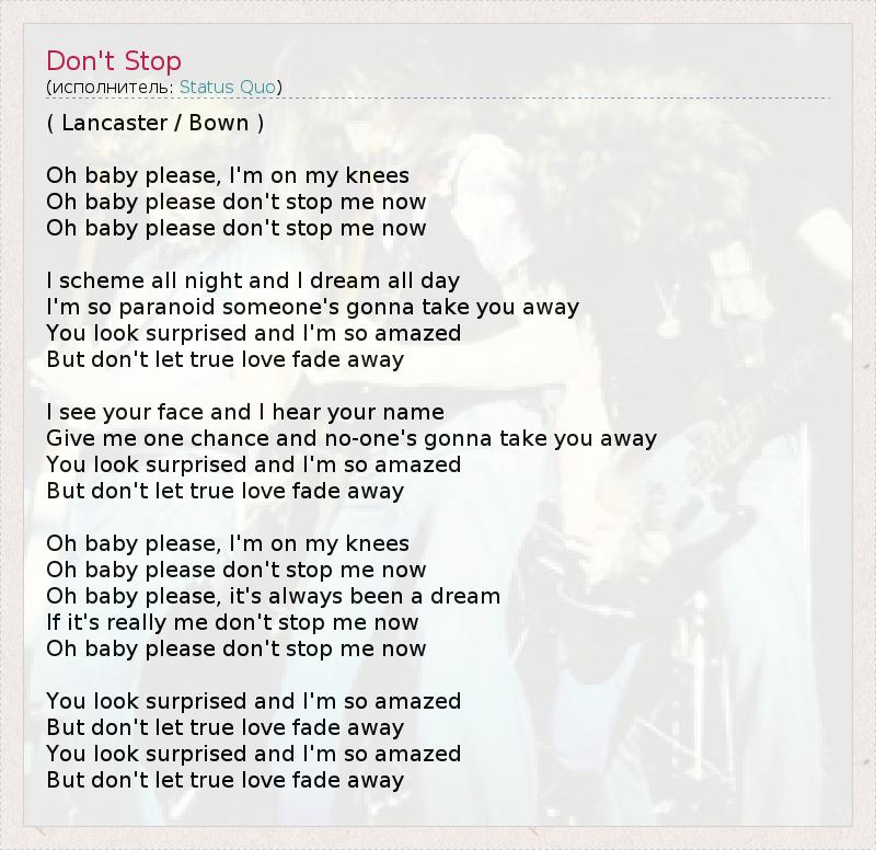 ( Lancaster / Bown ) Oh baby please, I'm on my knees Oh baby please don't stop me now Oh baby please don't stop me now I scheme all night and I dream all day I'm so paranoid someone's gonna take you away You look surprised and I'm so amazed But don't let true love fade away I see your face and I hear your name Give me one chance and no-one's gonna take you away You look surprised and I'm so amazed But don't let true love fade away Oh baby please, I'm on my knees Oh baby please don't stop me now Oh baby please, it's always been a dream If it's really me don't stop me now Oh baby please don't stop me now You look surprised and I'm so amazed But don't let true love fade away You look surprised and I'm so amazed But don't let true love fade away