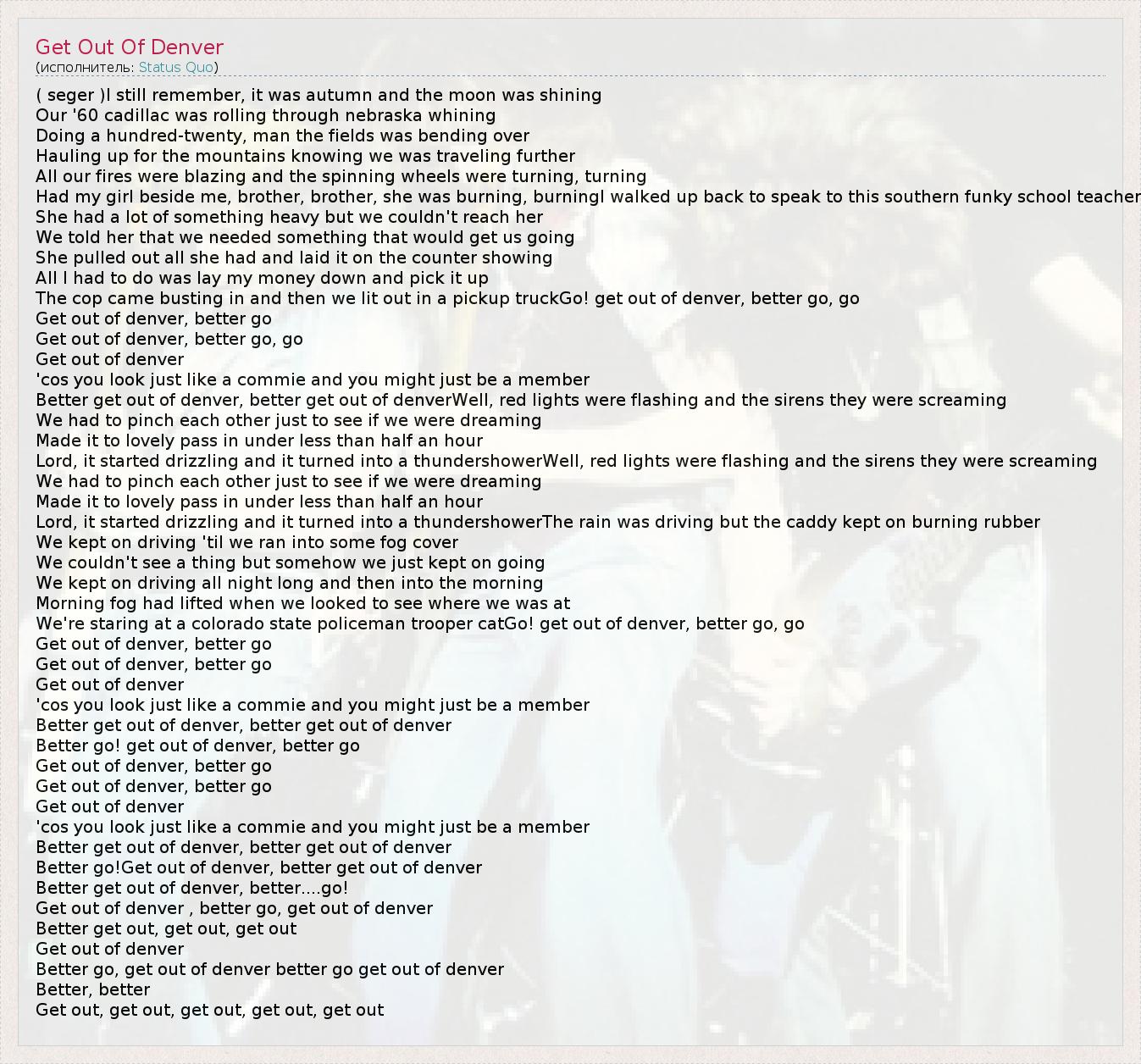 ( seger )I still remember, it was autumn and the moon was shining Our '60 cadillac was rolling through nebraska whining Doing a hundred-twenty, man the fields was bending over Hauling up for the mountains knowing we was traveling further All our fires were blazing and the spinning wheels were turning, turning Had my girl beside me, brother, brother, she was burning, burningI walked up back to speak to this southern funky school teacher She had a lot of something heavy but we couldn't reach her We told her that we needed something that would get us going She pulled out all she had and laid it on the counter showing All I had to do was lay my money down and pick it up The cop came busting in and then we lit out in a pickup truckGo! get out of denver, better go, go Get out of denver, better go Get out of denver, better go, go Get out of denver 'cos you look just like a commie and you might just be a member Better get out of denver, better get out of denverWell, red lights were flashing and the sirens they were screaming We had to pinch each other just to see if we were dreaming Made it to lovely pass in under less than half an hour Lord, it started drizzling and it turned into a thundershowerWell, red lights were flashing and the sirens they were screaming We had to pinch each other just to see if we were dreaming Made it to lovely pass in under less than half an hour Lord, it started drizzling and it turned into a thundershowerThe rain was driving but the caddy kept on burning rubber We kept on driving 'til we ran into some fog cover We couldn't see a thing but somehow we just kept on going We kept on driving all night long and then into the morning Morning fog had lifted when we looked to see where we was at We're staring at a colorado state policeman trooper catGo! get out of denver, better go, go Get out of denver, better go Get out of denver, better go Get out of denver 'cos you look just like a commie and you might just be a member Better get out of denver, better get out of denver Better go! get out of denver, better go Get out of denver, better go Get out of denver, better go Get out of denver 'cos you look just like a commie and you might just be a member Better get out of denver, better get out of denver Better go!Get out of denver, better get out of denver Better get out of denver, better....go! Get out of denver , better go, get out of denver Better get out, get out, get out Get out of denver Better go, get out of denver better go get out of denver Better, better Get out, get out, get out, get out, get out
