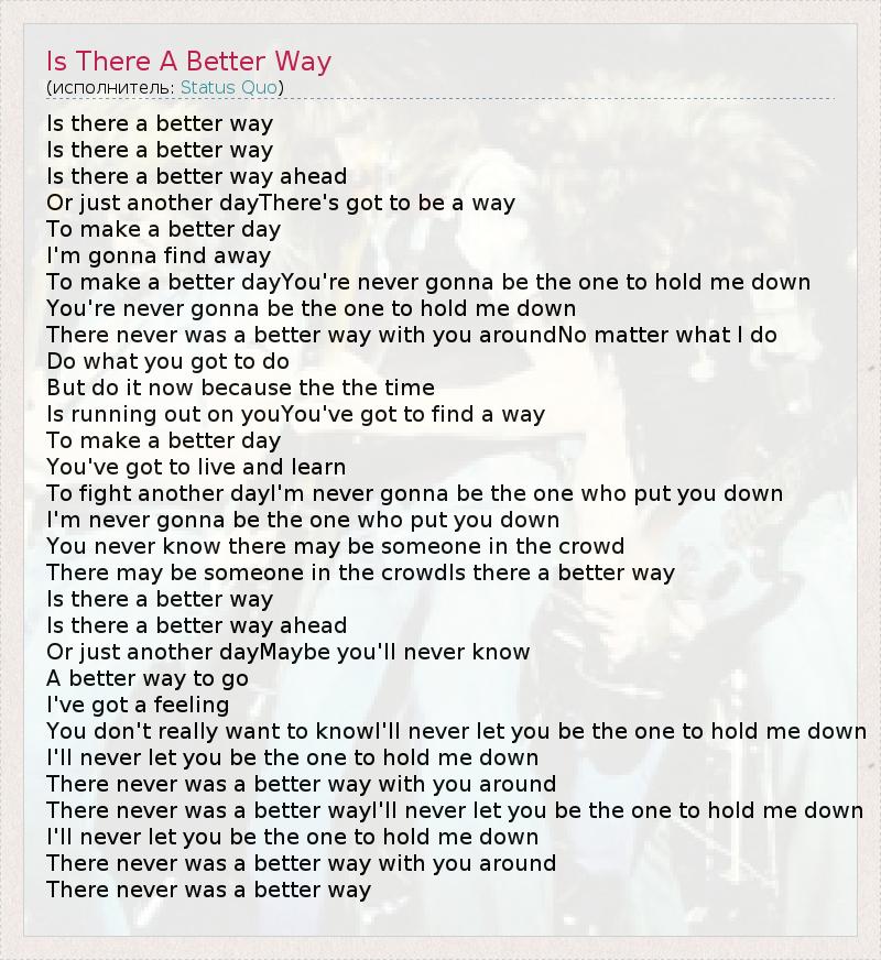 Is there a better way Is there a better way Is there a better way ahead Or just another dayThere's got to be a way To make a better day I'm gonna find away To make a better dayYou're never gonna be the one to hold me down You're never gonna be the one to hold me down There never was a better way with you aroundNo matter what I do Do what you got to do But do it now because the the time Is running out on youYou've got to find a way To make a better day You've got to live and learn To fight another dayI'm never gonna be the one who put you down I'm never gonna be the one who put you down You never know there may be someone in the crowd There may be someone in the crowdIs there a better way Is there a better way Is there a better way ahead Or just another dayMaybe you'll never know A better way to go I've got a feeling You don't really want to knowI'll never let you be the one to hold me down I'll never let you be the one to hold me down There never was a better way with you around There never was a better wayI'll never let you be the one to hold me down I'll never let you be the one to hold me down There never was a better way with you around There never was a better way