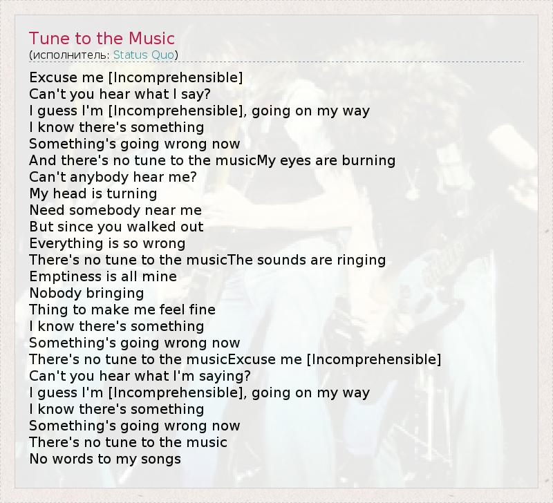 Excuse me [Incomprehensible] Can't you hear what I say? I guess I'm [Incomprehensible], going on my way I know there's something Something's going wrong now And there's no tune to the musicMy eyes are burning Can't anybody hear me? My head is turning Need somebody near me But since you walked out Everything is so wrong There's no tune to the musicThe sounds are ringing Emptiness is all mine Nobody bringing Thing to make me feel fine I know there's something Something's going wrong now There's no tune to the musicExcuse me [Incomprehensible] Can't you hear what I'm saying? I guess I'm [Incomprehensible], going on my way I know there's something Something's going wrong now There's no tune to the music No words to my songs