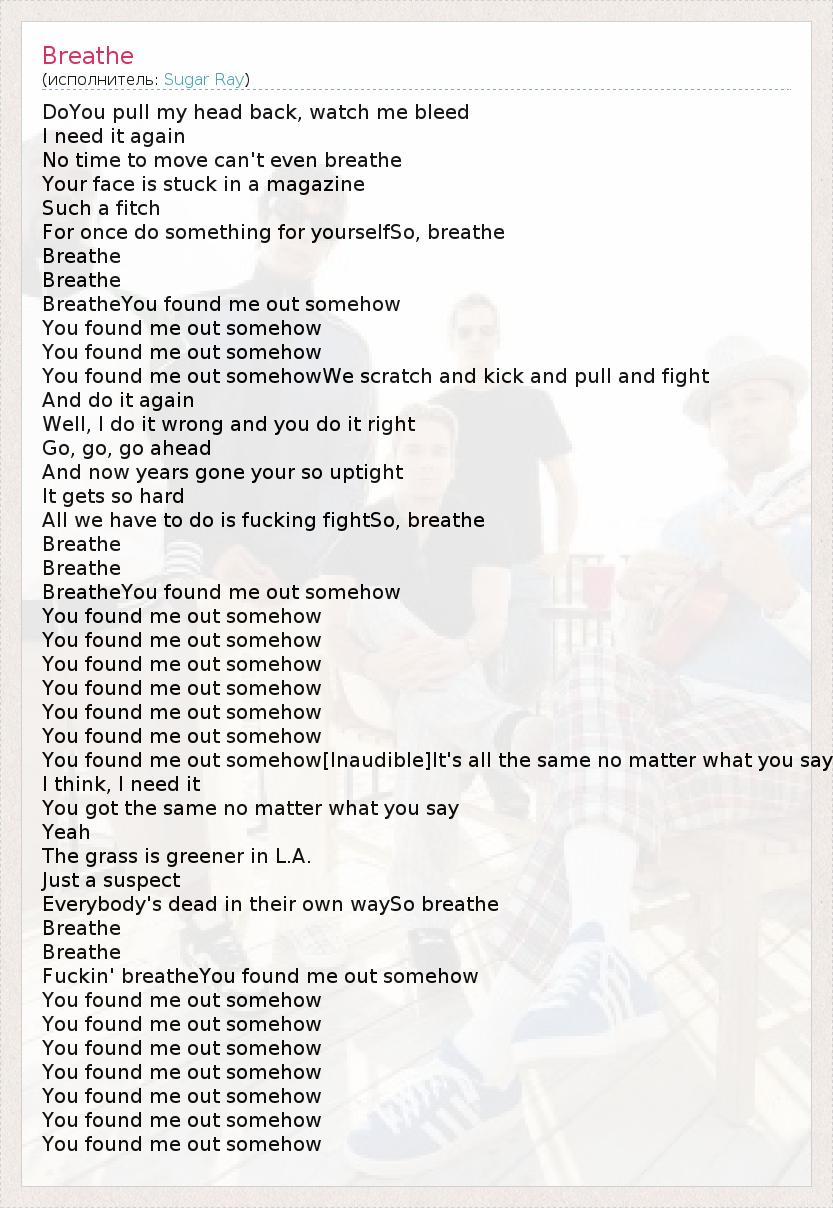DoYou pull my head back, watch me bleed I need it again No time to move can't even breathe Your face is stuck in a magazine Such a fitch For once do something for yourselfSo, breathe Breathe Breathe BreatheYou found me out somehow You found me out somehow You found me out somehow You found me out somehowWe scratch and kick and pull and fight And do it again Well, I do it wrong and you do it right Go, go, go ahead And now years gone your so uptight It gets so hard All we have to do is fucking fightSo, breathe Breathe Breathe BreatheYou found me out somehow You found me out somehow You found me out somehow You found me out somehow You found me out somehow You found me out somehow You found me out somehow You found me out somehow[Inaudible]It's all the same no matter what you say I think, I need it You got the same no matter what you say Yeah The grass is greener in L.A. Just a suspect Everybody's dead in their own waySo breathe Breathe Breathe Fuckin' breatheYou found me out somehow You found me out somehow You found me out somehow You found me out somehow You found me out somehow You found me out somehow You found me out somehow You found me out somehow