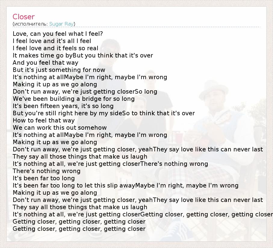 Love, can you feel what I feel? I feel love and it's all I feel I feel love and it feels so real It makes time go byBut you think that it's over And you feel that way But it's just something for now It's nothing at allMaybe I'm right, maybe I'm wrong Making it up as we go along Don't run away, we're just getting closerSo long We've been building a bridge for so long It's been fifteen years, it's so long But you're still right here by my sideSo to think that it's over How to feel that way We can work this out somehow It's nothing at allMaybe I'm right, maybe I'm wrong Making it up as we go along Don't run away, we're just getting closer, yeahThey say love like this can never last They say all those things that make us laugh It's nothing at all, we're just getting closerThere's nothing wrong There's nothing wrong It's been far too long It's been far too long to let this slip awayMaybe I'm right, maybe I'm wrong Making it up as we go along Don't run away, we're just getting closer, yeahThey say love like this can never last They say all those things that make us laugh It's nothing at all, we're just getting closerGetting closer, getting closer, getting closer Getting closer, getting closer, getting closer Getting closer, getting closer, getting closer