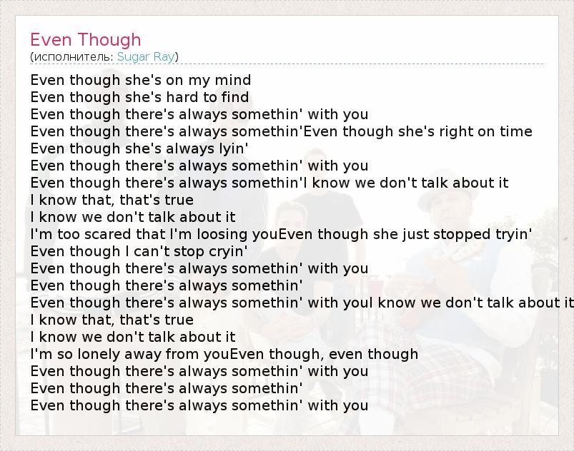 Even though she's on my mind Even though she's hard to find Even though there's always somethin' with you Even though there's always somethin'Even though she's right on time Even though she's always lyin' Even though there's always somethin' with you Even though there's always somethin'I know we don't talk about it I know that, that's true I know we don't talk about it I'm too scared that I'm loosing youEven though she just stopped tryin' Even though I can't stop cryin' Even though there's always somethin' with you Even though there's always somethin' Even though there's always somethin' with youI know we don't talk about it I know that, that's true I know we don't talk about it I'm so lonely away from youEven though, even though Even though there's always somethin' with you Even though there's always somethin' Even though there's always somethin' with you