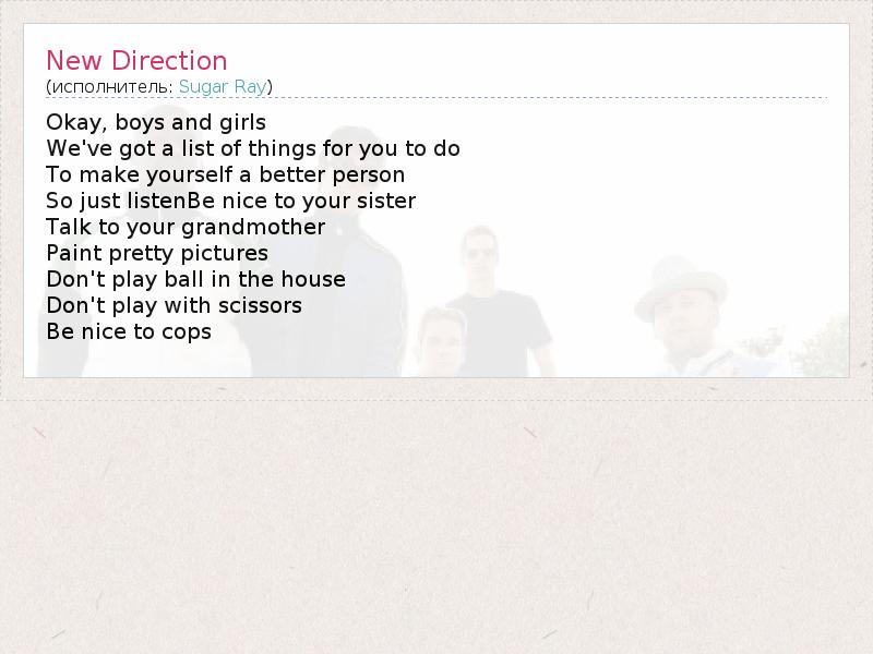 Okay, boys and girls We've got a list of things for you to do To make yourself a better person So just listenBe nice to your sister Talk to your grandmother Paint pretty pictures Don't play ball in the house Don't play with scissors Be nice to cops