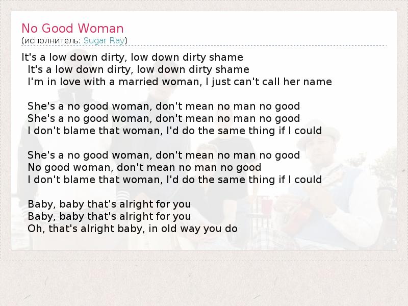 It's a low down dirty, low down dirty shame It's a low down dirty, low down dirty shame I'm in love with a married woman, I just can't call her name She's a no good woman, don't mean no man no good She's a no good woman, don't mean no man no good I don't blame that woman, I'd do the same thing if I could She's a no good woman, don't mean no man no good No good woman, don't mean no man no good I don't blame that woman, I'd do the same thing if I could Baby, baby that's alright for you Baby, baby that's alright for you Oh, that's alright baby, in old way you do