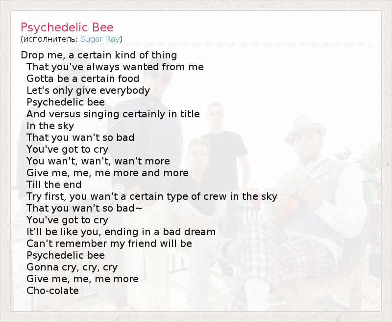 Drop me, a certain kind of thing That you've always wanted from me Gotta be a certain food Let's only give everybody Psychedelic bee And versus singing certainly in title In the sky That you wan't so bad You've got to cry You wan't, wan't, wan't more Give me, me, me more and more Till the end Try first, you wan't a certain type of crew in the sky That you wan't so bad~ You've got to cry It'll be like you, ending in a bad dream Can't remember my friend will be Psychedelic bee Gonna cry, cry, cry Give me, me, me more Cho-colate