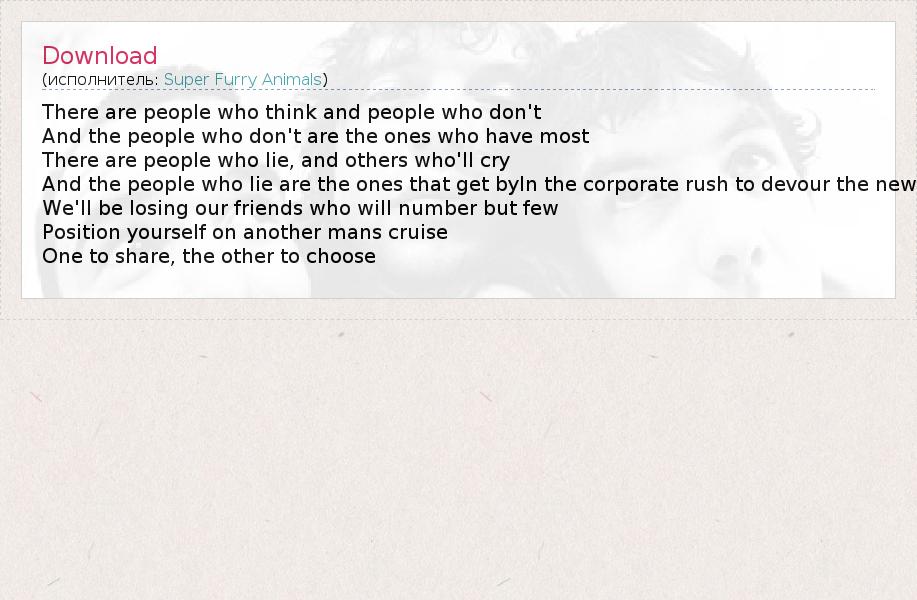 There are people who think and people who don't And the people who don't are the ones who have most There are people who lie, and others who'll cry And the people who lie are the ones that get byIn the corporate rush to devour the new We'll be losing our friends who will number but few Position yourself on another mans cruise One to share, the other to choose