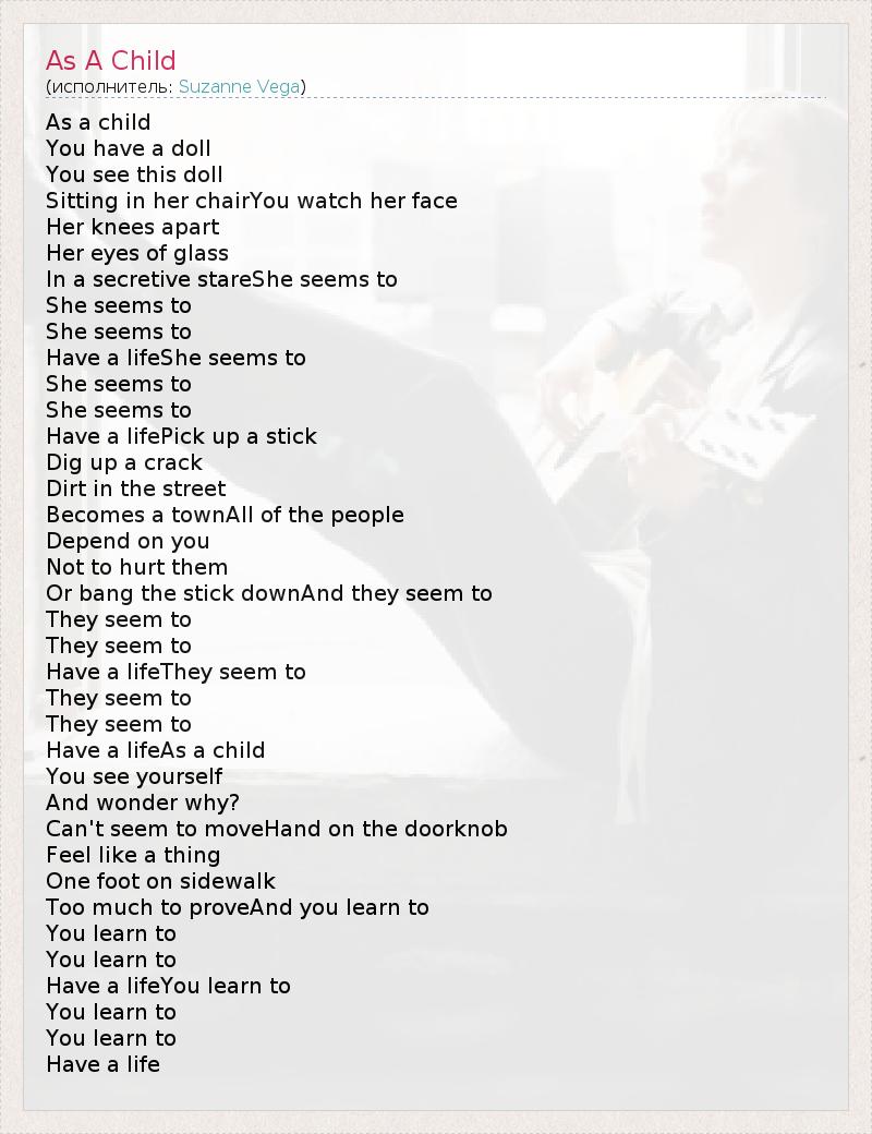 Это интересно:Сюзанна Надин Вега (англ. Suzanne Nadine Vega, род. 11 июля 1959 года в Санта-Монике, штат Калифорния) - американская инди-вокалистка, автор песен и музыки на базе фольклора, гитаристка, самая яркая тема — Tom's Diner.Однажды маленькая Сьюзанн и соседский парень Марк сидели на скамейке во дворе. Им обоим было по 4 года. Вдруг девочка нечаянно уронила свой взгляд на ухажера и нежным голоском... продолжение