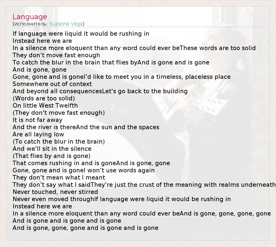If language were liquid it would be rushing in Instead here we are In a silence more eloquent than any word could ever beThese words are too solid They don't move fast enough To catch the blur in the brain that flies byAnd is gone and is gone And is gone, gone Gone, gone and is goneI'd like to meet you in a timeless, placeless place Somewhere out of context And beyond all consequencesLet's go back to the building (Words are too solid) On little West Twelfth (They don't move fast enough) It is not far away And the river is thereAnd the sun and the spaces Are all laying low (To catch the blur in the brain) And we'll sit in the silence (That flies by and is gone) That comes rushing in and is goneAnd is gone, gone Gone, gone and is goneI won't use words again They don't mean what I meant They don't say what I saidThey're just the crust of the meaning with realms underneath Never touched, never stirred Never even moved throughIf language were liquid it would be rushing in Instead here we are In a silence more eloquent than any word could ever beAnd is gone, gone, gone, gone And is gone and is gone and is gone And is gone, gone, gone and is gone and is gone