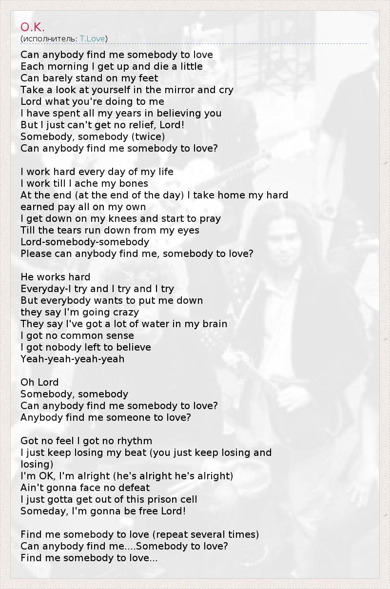 Can anybody find me somebody to love Each morning I get up and die a little Can barely stand on my feet Take a look at yourself in the mirror and cry Lord what you're doing to me I have spent all my years in believing you But I just can't get no relief, Lord! Somebody, somebody (twice) Can anybody find me somebody to love? I work hard every day of my life I work till I ache my bones At the end (at the end of the day) I take home my hard earned pay all on my own I get down on my knees and start to pray Till the tears run down from my eyes Lord-somebody-somebody Please can anybody find me, somebody to love? He works hard Everyday-I try and I try and I try But everybody wants to put me down they say I'm going crazy They say I've got a lot of water in my brain I got no common sense I got nobody left to believe Yeah-yeah-yeah-yeah Oh Lord Somebody, somebody Can anybody find me somebody to love? Anybody find me someone to love? Got no feel I got no rhythm I just keep losing my beat (you just keep losing and losing) I'm OK, I'm alright (he's alright he's alright) Ain't gonna face no defeat I just gotta get out of this prison cell Someday, I'm gonna be free Lord! Find me somebody to love (repeat several times) Can anybody find me....Somebody to love? Find me somebody to love...