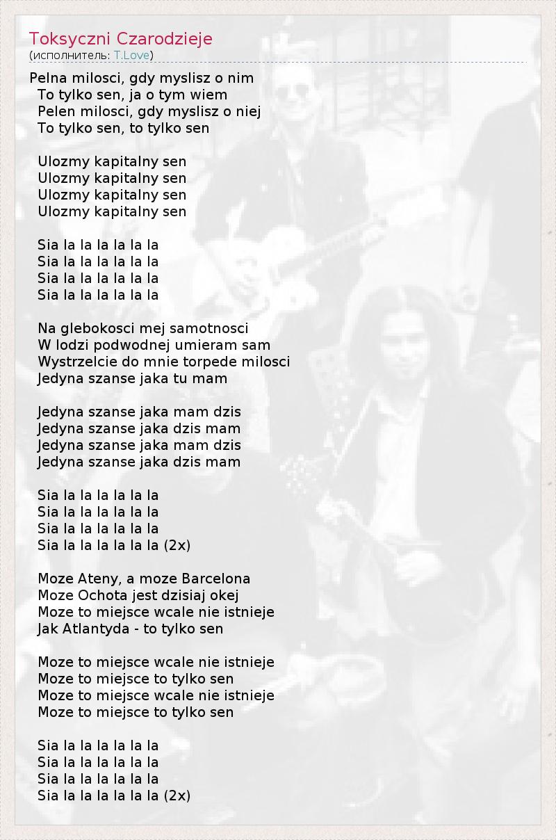 Pelna milosci, gdy myslisz o nim To tylko sen, ja o tym wiem Pelen milosci, gdy myslisz o niej To tylko sen, to tylko sen Ulozmy kapitalny sen Ulozmy kapitalny sen Ulozmy kapitalny sen Ulozmy kapitalny sen Sia la la la la la la Sia la la la la la la Sia la la la la la la Sia la la la la la la Na glebokosci mej samotnosci W lodzi podwodnej umieram sam Wystrzelcie do mnie torpede milosci Jedyna szanse jaka tu mam Jedyna szanse jaka mam dzis Jedyna szanse jaka dzis mam Jedyna szanse jaka mam dzis Jedyna szanse jaka dzis mam Sia la la la la la la Sia la la la la la la Sia la la la la la la Sia la la la la la la (2x) Moze Ateny, a moze Barcelona Moze Ochota jest dzisiaj okej Moze to miejsce wcale nie istnieje Jak Atlantyda - to tylko sen Moze to miejsce wcale nie istnieje Moze to miejsce to tylko sen Moze to miejsce wcale nie istnieje Moze to miejsce to tylko sen Sia la la la la la la Sia la la la la la la Sia la la la la la la Sia la la la la la la (2x)