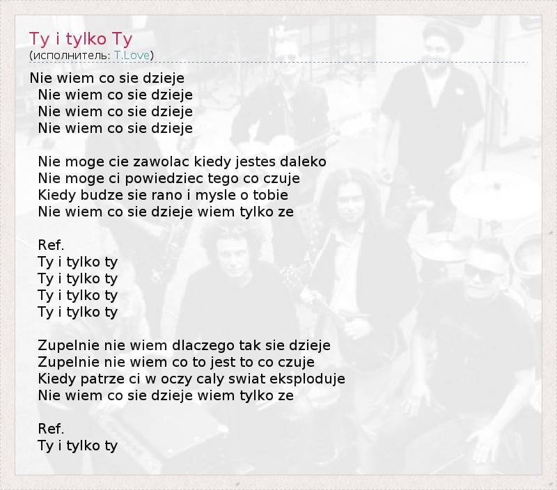 Nie wiem co sie dzieje Nie wiem co sie dzieje Nie wiem co sie dzieje Nie wiem co sie dzieje Nie moge cie zawolac kiedy jestes daleko Nie moge ci powiedziec tego co czuje Kiedy budze sie rano i mysle o tobie Nie wiem co sie dzieje wiem tylko ze Ref. Ty i tylko ty Ty i tylko ty Ty i tylko ty Ty i tylko ty Zupelnie nie wiem dlaczego tak sie dzieje Zupelnie nie wiem co to jest to co czuje Kiedy patrze ci w oczy caly swiat eksploduje Nie wiem co sie dzieje wiem tylko ze Ref. Ty i tylko ty