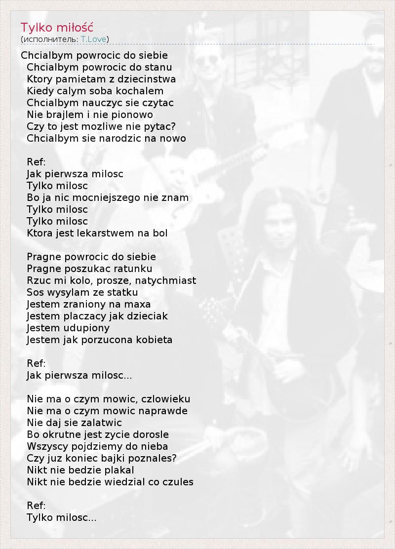 Chcialbym powrocic do siebie Chcialbym powrocic do stanu Ktory pamietam z dziecinstwa Kiedy calym soba kochalem Chcialbym nauczyc sie czytac Nie brajlem i nie pionowo Czy to jest mozliwe nie pytac? Chcialbym sie narodzic na nowo Ref: Jak pierwsza milosc Tylko milosc Bo ja nic mocniejszego nie znam Tylko milosc Tylko milosc Ktora jest lekarstwem na bol Pragne powrocic do siebie Pragne poszukac ratunku Rzuc mi kolo, prosze, natychmiast Sos wysylam ze statku Jestem zraniony na maxa Jestem placzacy jak dzieciak Jestem udupiony Jestem jak porzucona kobieta Ref: Jak pierwsza milosc... Nie ma o czym mowic, czlowieku Nie ma o czym mowic naprawde Nie daj sie zalatwic Bo okrutne jest zycie dorosle Wszyscy pojdziemy do nieba Czy juz koniec bajki poznales? Nikt nie bedzie plakal Nikt nie bedzie wiedzial co czules Ref: Tylko milosc...