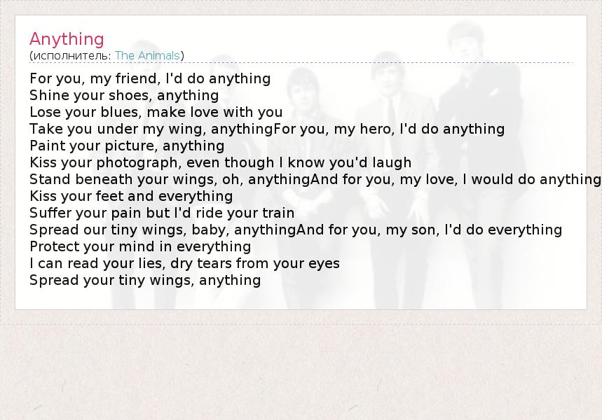 Это интересно:В начале 60-х в Ньюкасле существовала ритм-энд-блюзовая команда "Alan Price Rhythm and Blues Combo", в которой играли пианист Алан Прайс (р. 19 апреля 1942), барабанщик Джон Стил (р. 4 февраля 1941) и бас-гитарист Брайан "Чес" Чендлер (р.18 декабря 1938). В 1963 году к группе присоединились вокалист Эрик Бердон (р. 11 мая 1941) и гитарист Хилтон Валентайн (р. 22 мая 1943), и с приходом последнего коллектив сменил название... продолжение