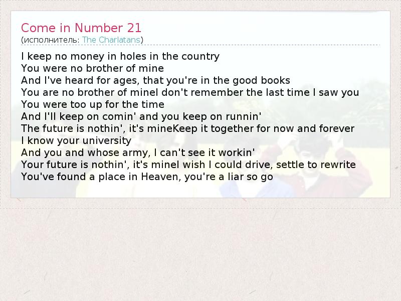 А как ты думаешь, о чем песня "Come in Number 21" ?