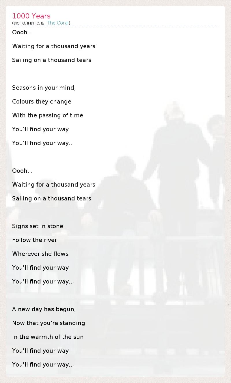 Oooh... Waiting for a thousand years Sailing on a thousand tears Seasons in your mind, Colours they change With the passing of time You'll find your way You'll find your way... Oooh... Waiting for a thousand years Sailing on a thousand tears Signs set in stone Follow the river Wherever she flows You'll find your way You'll find your way... A new day has begun, Now that you're standing In the warmth of the sun You'll find your way You'll find your way...