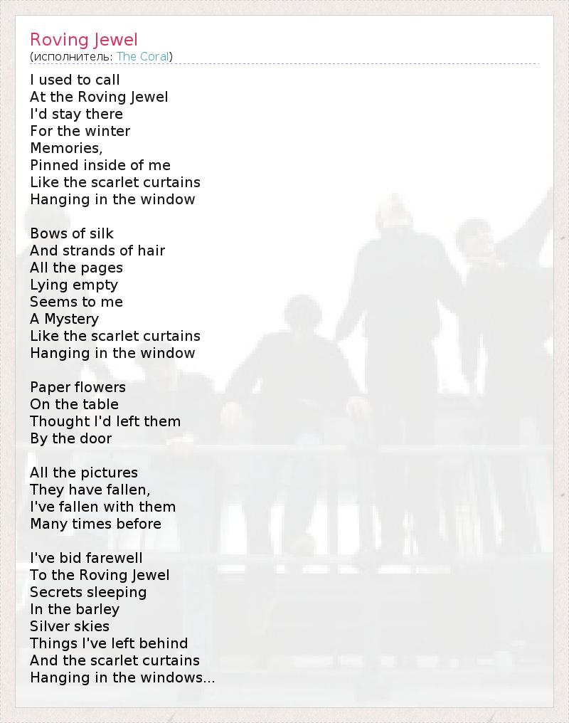 Я использовал, чтобы позвонить В передвижных Jewel Я останусь там На зиму Воспоминания, Важная внутри меня Как алых занавесок Висячие в окне Луки из шелка И пряди волос Все страницы Лежа пуст Мне кажется загадка Как алых занавесок Висячие в окне Бумажные цветы На столе Мысль я оставил их К двери Все фотографии Они упали, Я упал с ними Много раз , прежде чем Я попрощался К особым поручениям Jewel Секреты спальные В ячменя Серебряные небеса Вещи я оставил И алые занавески Висячие в окнах ...