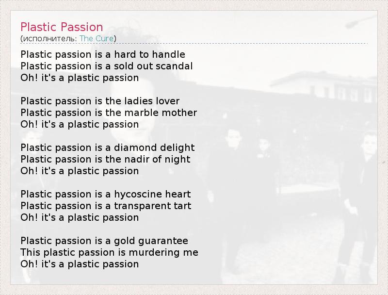А как ты думаешь, о чем песня "Plastic Passion" ?