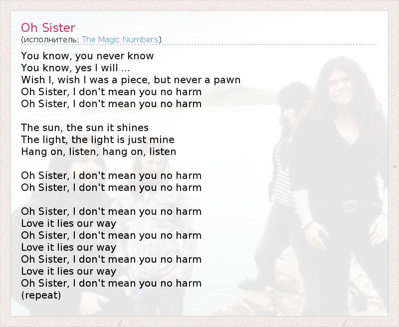 You know, you never know You know, yes I will ... Wish I, wish I was a piece, but never a pawn Oh Sister, I don't mean you no harm Oh Sister, I don't mean you no harm The sun, the sun it shines The light, the light is just mine Hang on, listen, hang on, listen Oh Sister, I don't mean you no harm Oh Sister, I don't mean you no harm Oh Sister, I don't mean you no harm Love it lies our way Oh Sister, I don't mean you no harm Love it lies our way Oh Sister, I don't mean you no harm Love it lies our way Oh Sister, I don't mean you no harm (repeat)