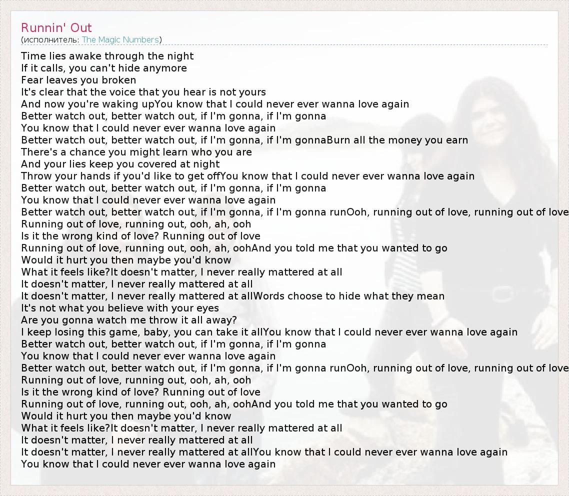 Time lies awake through the night If it calls, you can't hide anymore Fear leaves you broken It's clear that the voice that you hear is not yours And now you're waking upYou know that I could never ever wanna love again Better watch out, better watch out, if I'm gonna, if I'm gonna You know that I could never ever wanna love again Better watch out, better watch out, if I'm gonna, if I'm gonnaBurn all the money you earn There's a chance you might learn who you are And your lies keep you covered at night Throw your hands if you'd like to get offYou know that I could never ever wanna love again Better watch out, better watch out, if I'm gonna, if I'm gonna You know that I could never ever wanna love again Better watch out, better watch out, if I'm gonna, if I'm gonna runOoh, running out of love, running out of love Running out of love, running out, ooh, ah, ooh Is it the wrong kind of love? Running out of love Running out of love, running out, ooh, ah, oohAnd you told me that you wanted to go Would it hurt you then maybe you'd know What it feels like?It doesn't matter, I never really mattered at all It doesn't matter, I never really mattered at all It doesn't matter, I never really mattered at allWords choose to hide what they mean It's not what you believe with your eyes Are you gonna watch me throw it all away? I keep losing this game, baby, you can take it allYou know that I could never ever wanna love again Better watch out, better watch out, if I'm gonna, if I'm gonna You know that I could never ever wanna love again Better watch out, better watch out, if I'm gonna, if I'm gonna runOoh, running out of love, running out of love Running out of love, running out, ooh, ah, ooh Is it the wrong kind of love? Running out of love Running out of love, running out, ooh, ah, oohAnd you told me that you wanted to go Would it hurt you then maybe you'd know What it feels like?It doesn't matter, I never really mattered at all It doesn't matter, I never really mattered at all It doesn't matter, I never really mattered at allYou know that I could never ever wanna love again You know that I could never ever wanna love again