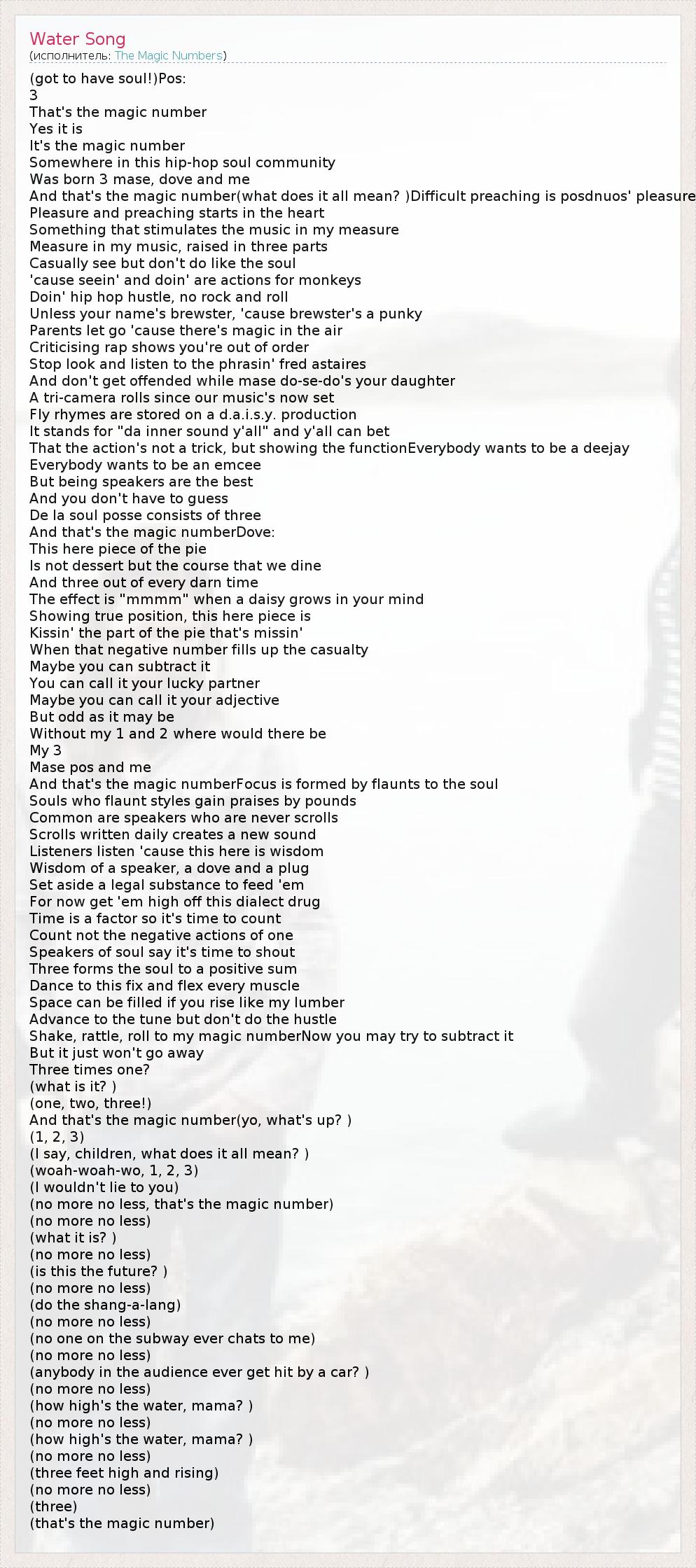 (got to have soul!)Pos: 3 That's the magic number Yes it is It's the magic number Somewhere in this hip-hop soul community Was born 3 mase, dove and me And that's the magic number(what does it all mean? )Difficult preaching is posdnuos' pleasure Pleasure and preaching starts in the heart Something that stimulates the music in my measure Measure in my music, raised in three parts Casually see but don't do like the soul 'cause seein' and doin' are actions for monkeys Doin' hip hop hustle, no rock and roll Unless your name's brewster, 'cause brewster's a punky Parents let go 'cause there's magic in the air Criticising rap shows you're out of order Stop look and listen to the phrasin' fred astaires And don't get offended while mase do-se-do's your daughter A tri-camera rolls since our music's now set Fly rhymes are stored on a d.a.i.s.y. production It stands for "da inner sound y'all" and y'all can bet That the action's not a trick, but showing the functionEverybody wants to be a deejay Everybody wants to be an emcee But being speakers are the best And you don't have to guess De la soul posse consists of three And that's the magic numberDove: This here piece of the pie Is not dessert but the course that we dine And three out of every darn time The effect is "mmmm" when a daisy grows in your mind Showing true position, this here piece is Kissin' the part of the pie that's missin' When that negative number fills up the casualty Maybe you can subtract it You can call it your lucky partner Maybe you can call it your adjective But odd as it may be Without my 1 and 2 where would there be My 3 Mase pos and me And that's the magic numberFocus is formed by flaunts to the soul Souls who flaunt styles gain praises by pounds Common are speakers who are never scrolls Scrolls written daily creates a new sound Listeners listen 'cause this here is wisdom Wisdom of a speaker, a dove and a plug Set aside a legal substance to feed 'em For now get 'em high off this dialect drug Time is a factor so it's time to count Count not the negative actions of one Speakers of soul say it's time to shout Three forms the soul to a positive sum Dance to this fix and flex every muscle Space can be filled if you rise like my lumber Advance to the tune but don't do the hustle Shake, rattle, roll to my magic numberNow you may try to subtract it But it just won't go away Three times one? (what is it? ) (one, two, three!) And that's the magic number(yo, what's up? ) (1, 2, 3) (I say, children, what does it all mean? ) (woah-woah-wo, 1, 2, 3) (I wouldn't lie to you) (no more no less, that's the magic number) (no more no less) (what it is? ) (no more no less) (is this the future? ) (no more no less) (do the shang-a-lang) (no more no less) (no one on the subway ever chats to me) (no more no less) (anybody in the audience ever get hit by a car? ) (no more no less) (how high's the water, mama? ) (no more no less) (how high's the water, mama? ) (no more no less) (three feet high and rising) (no more no less) (three) (that's the magic number)