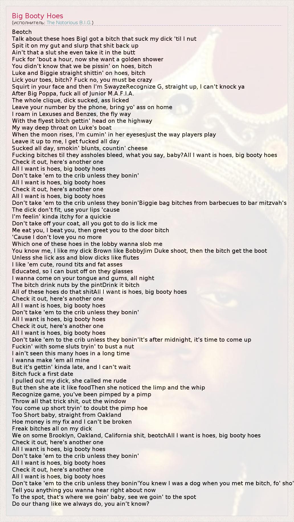 Beotch Talk about these hoes BigI got a bitch that suck my dick 'til I nut Spit it on my gut and slurp that shit back up Ain't that a slut she even take it in the butt Fuck for 'bout a hour, now she want a golden shower You didn't know that we be pissin' on hoes, bitch Luke and Biggie straight shittin' on hoes, bitch Lick your toes, bitch? Fuck no, you must be crazy Squirt in your face and then I'm SwayzeRecognize G, straight up, I can't knock ya After Big Poppa, fuck all of Junior M.A.F.I.A. The whole clique, dick sucked, ass licked Leave your number by the phone, bring yo' ass on home I roam in Lexuses and Benzes, the fly way With the flyest bitch gettin' head on the highway My way deep throat on Luke's boat When the moon rises, I'm cumin' in her eyesesJust the way players play Leave it up to me, I get fucked all day Sucked all day, smokin' blunts, countin' cheese Fucking bitches til they assholes bleed, what you say, baby?All I want is hoes, big booty hoes Check it out, here's another one All I want is hoes, big booty hoes Don't take 'em to the crib unless they bonin' All I want is hoes, big booty hoes Check it out, here's another one All I want is hoes, big booty hoes Don't take 'em to the crib unless they bonin'Biggie bag bitches from barbecues to bar mitzvah's The dick don't fit, use your lips 'cause I'm feelin' kinda itchy for a quickie Don't take off your coat, all you got to do is lick me Me eat you, I beat you, then greet you to the door bitch 'Cause I don't love you no more Which one of these hoes in the lobby wanna slob me You know me, I like my dick Brown like BobbyJim Duke shoot, then the bitch get the boot Unless she lick ass and blow dicks like flutes I like 'em cute, round tits and fat asses Educated, so I can bust off on they glasses I wanna come on your tongue and gums, all night The bitch drink nuts by the pintDrink it bitch All of these hoes do that shitAll I want is hoes, big booty hoes Check it out, here's another one All I want is hoes, big booty hoes Don't take 'em to the crib unless they bonin' All I want is hoes, big booty hoes Check it out, here's another one All I want is hoes, big booty hoes Don't take 'em to the crib unless they bonin'It's after midnight, it's time to come up Fuckin' with some sluts tryin' to bust a nut I ain't seen this many hoes in a long time I wanna make 'em all mine But it's gettin' kinda late, and I can't wait Bitch fuck a first date I pulled out my dick, she called me rude But then she ate it like foodThen she noticed the limp and the whip Recognize game, you've been pimped by a pimp Throw all that trick shit, out the window You come up short tryin' to doubt the pimp hoe Too Short baby, straight from Oakland Hoe money is my fix and I can't be broken Freak bitches all on my dick We on some Brooklyn, Oakland, California shit, beotchAll I want is hoes, big booty hoes Check it out, here's another one All I want is hoes, big booty hoes Don't take 'em to the crib unless they bonin' All I want is hoes, big booty hoes Check it out, here's another one All I want is hoes, big booty hoes Don't take 'em to the crib unless they bonin'You knew I was a dog when you met me bitch, fo' sho' Tell you anything you wanna hear right about now To the spot, that's where we goin' baby, see we goin' to the spot Do our thang like we always do, you ain't know?