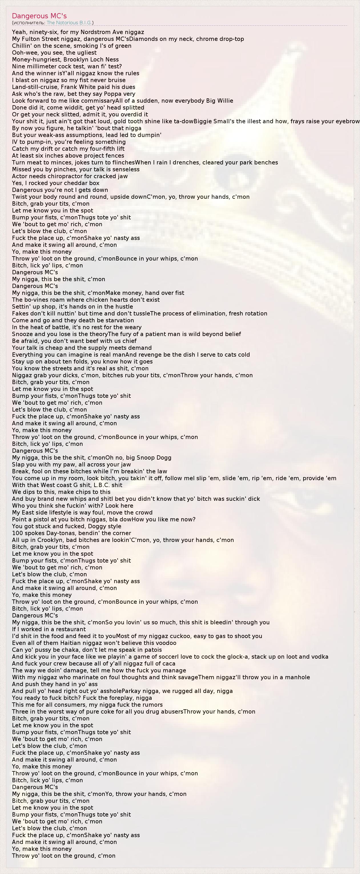 Yeah, ninety-six, for my Nordstrom Ave niggaz My Fulton Street niggaz, dangerous MC'sDiamonds on my neck, chrome drop-top Chillin' on the scene, smoking l's of green Ooh-wee, you see, the ugliest Money-hungriest, Brooklyn Loch Ness Nine millimeter cock test, wan fi' test? And the winner isY'all niggaz know the rules I blast on niggaz so my fist never bruise Land-still-cruise, Frank White paid his dues Ask who's the raw, bet they say Poppa very Look forward to me like commissaryAll of a sudden, now everybody Big Willie Done did it, come widdit, get yo' head splitted Or get your neck slitted, admit it, you overdid it Your shit it, just ain't got that loud, gold tooth shine like ta-dowBiggie Small's the illest and how, frays raise your eyebrow By now you figure, he talkin' 'bout that nigga But your weak-ass assumptions, lead led to dumpin' IV to pump-in, you're feeling something Catch my drift or catch my four-fifth lift At least six inches above project fences Turn meat to minces, jokes turn to flinchesWhen I rain I drenches, cleared your park benches Missed you by pinches, your talk is senseless Actor needs chiropractor for cracked jaw Yes, I rocked your cheddar box Dangerous you're not I gets down Twist your body round and round, upside downC'mon, yo, throw your hands, c'mon Bitch, grab your tits, c'mon Let me know you in the spot Bump your fists, c'monThugs tote yo' shit We 'bout to get mo' rich, c'mon Let's blow the club, c'mon Fuck the place up, c'monShake yo' nasty ass And make it swing all around, c'mon Yo, make this money Throw yo' loot on the ground, c'monBounce in your whips, c'mon Bitch, lick yo' lips, c'mon Dangerous MC's My nigga, this be the shit, c'mon Dangerous MC's My nigga, this be the shit, c'monMake money, hand over fist The bo-vines roam where chicken hearts don't exist Settin' up shop, it's hands on in the hustle Fakes don't kill nuttin' but time and don't tussleThe process of elimination, fresh rotation Come and go and they death be starvation In the heat of battle, it's no rest for the weary Snooze and you lose is the theoryThe fury of a patient man is wild beyond belief Be afraid, you don't want beef with us chief Your talk is cheap and the supply meets demand Everything you can imagine is real manAnd revenge be the dish I serve to cats cold Stay up on about ten folds, you know how it goes You know the streets and it's real as shit, c'mon Niggaz grab your dicks, c'mon, bitches rub your tits, c'monThrow your hands, c'mon Bitch, grab your tits, c'mon Let me know you in the spot Bump your fists, c'monThugs tote yo' shit We 'bout to get mo' rich, c'mon Let's blow the club, c'mon Fuck the place up, c'monShake yo' nasty ass And make it swing all around, c'mon Yo, make this money Throw yo' loot on the ground, c'monBounce in your whips, c'mon Bitch, lick yo' lips, c'mon Dangerous MC's My nigga, this be the shit, c'monOh no, big Snoop Dogg Slap you with my paw, all across your jaw Break, fool on these bitches while I'm breakin' the law You come up in my room, look bitch, you takin' it off, follow meI slip 'em, slide 'em, rip 'em, ride 'em, provide 'em With that West coast G shit, L.B.C. shit We dips to this, make chips to this And buy brand new whips and shitI bet you didn't know that yo' bitch was suckin' dick Who you think she fuckin' with? Look here My East side lifestyle is way foul, move the crowd Point a pistol at you bitch niggas, bla dowHow you like me now? You got stuck and fucked, Doggy style 100 spokes Day-tonas, bendin' the corner All up in Crooklyn, bad bitches are lookin'C'mon, yo, throw your hands, c'mon Bitch, grab your tits, c'mon Let me know you in the spot Bump your fists, c'monThugs tote yo' shit We 'bout to get mo' rich, c'mon Let's blow the club, c'mon Fuck the place up, c'monShake yo' nasty ass And make it swing all around, c'mon Yo, make this money Throw yo' loot on the ground, c'monBounce in your whips, c'mon Bitch, lick yo' lips, c'mon Dangerous MC's My nigga, this be the shit, c'monSo you lovin' us so much, this shit is bleedin' through you If I worked in a restaurant I'd shit in the food and feed it to youMost of my niggaz cuckoo, easy to gas to shoot you Even all of them Haitian niggaz won't believe this voodoo Can yo' pussy be chaka, don't let me speak in patois And kick you in your face like we playin' a game of soccerI love to cock the glock-a, stack up on loot and vodka And fuck your crew because all of y'all niggaz full of caca The way we doin' damage, tell me how the fuck you manage With my niggaz who marinate on foul thoughts and think savageThem niggaz'll throw you in a manhole And push they hand in yo' ass And pull yo' head right out yo' assholeParkay nigga, we rugged all day, nigga You ready to fuck bitch? Fuck the foreplay, nigga This me for all consumers, my nigga fuck the rumors Three in the worst way of pure coke for all you drug abusersThrow your hands, c'mon Bitch, grab your tits, c'mon Let me know you in the spot Bump your fists, c'monThugs tote yo' shit We 'bout to get mo' rich, c'mon Let's blow the club, c'mon Fuck the place up, c'monShake yo' nasty ass And make it swing all around, c'mon Yo, make this money Throw yo' loot on the ground, c'monBounce in your whips, c'mon Bitch, lick yo' lips, c'mon Dangerous MC's My nigga, this be the shit, c'monYo, throw your hands, c'mon Bitch, grab your tits, c'mon Let me know you in the spot Bump your fists, c'monThugs tote yo' shit We 'bout to get mo' rich, c'mon Let's blow the club, c'mon Fuck the place up, c'monShake yo' nasty ass And make it swing all around, c'mon Yo, make this money Throw yo' loot on the ground, c'mon