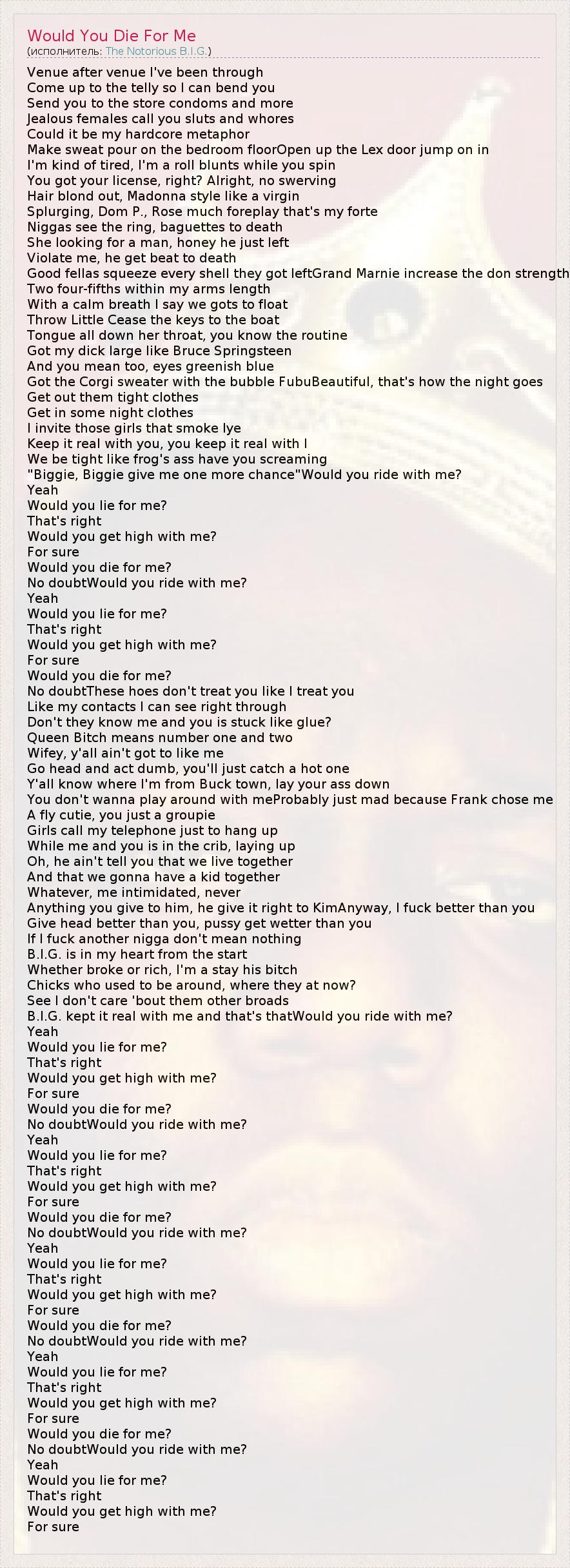 B.I.G. kept it real with me and that's thatWould you ride with me?