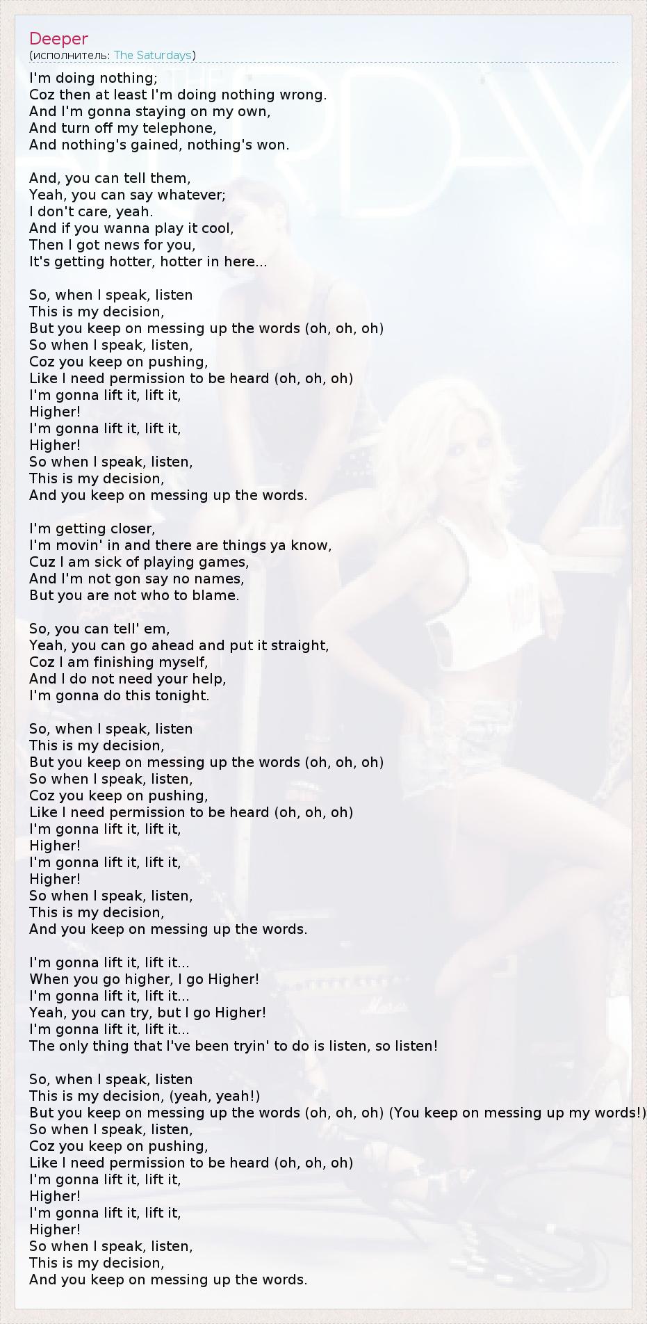 Это интересно:Совсем еще молодая, но уже набирающая обороты популярности, поп-группа «The Saturdays» собралась в 2007 году в Великобритании. В состав группы входят Уна Хили, Молли Кинг, Френки Сэндфорд, Ванесса Уайт и Рошель Вайсман, причем Френки и Рошель до этого вместе были участницами британской поп-группы «S Club 8», которая просуществовала до 2004. Дебютный альбом «The Saturdays» 2008 года «Chasing Lights» вошел в десятку... продолжение