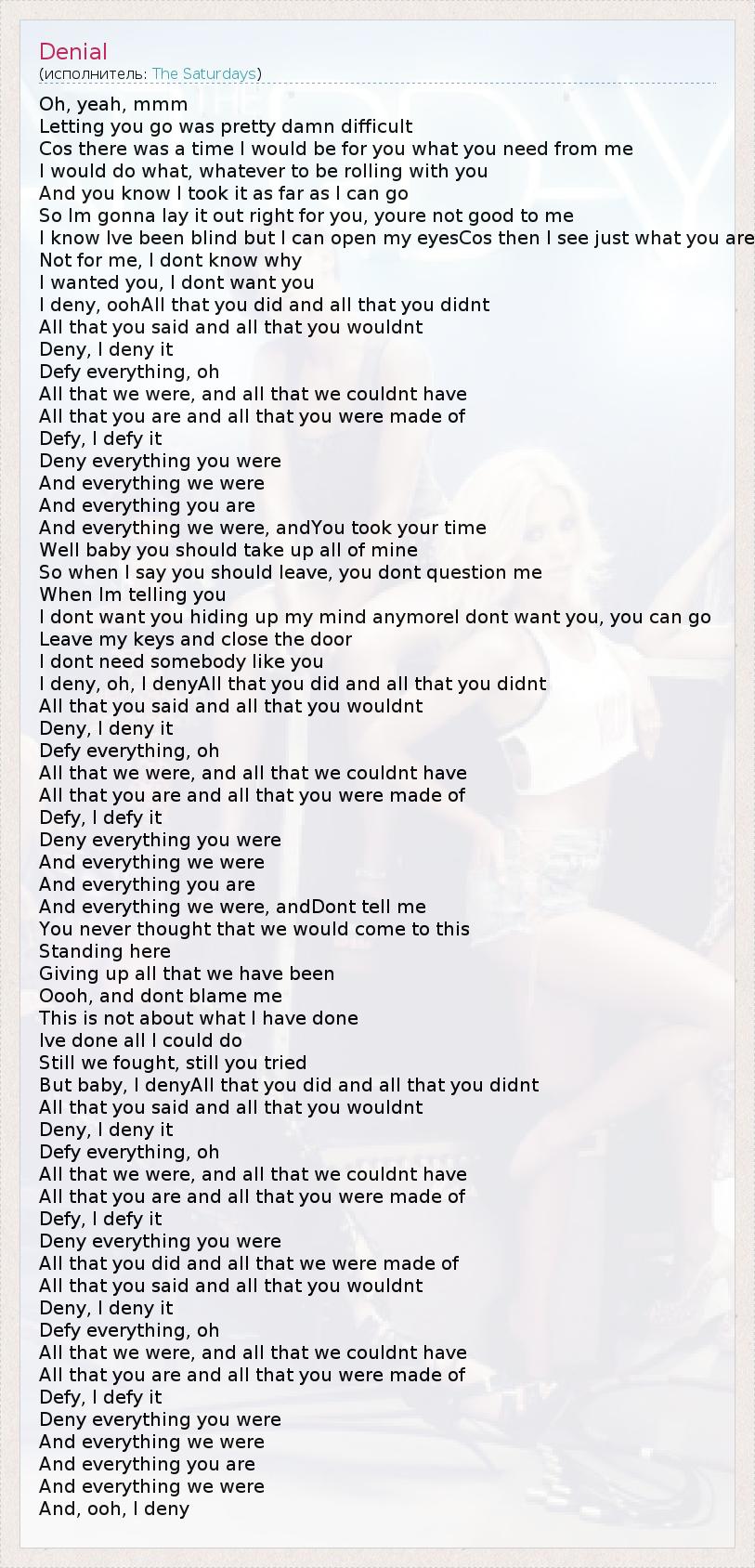 Oh, yeah, mmm Letting you go was pretty damn difficult Cos there was a time I would be for you what you need from me I would do what, whatever to be rolling with you And you know I took it as far as I can go So Im gonna lay it out right for you, youre not good to me I know Ive been blind but I can open my eyesCos then I see just what you are Not for me, I dont know why I wanted you, I dont want you I deny, oohAll that you did and all that you didnt All that you said and all that you wouldnt Deny, I deny it Defy everything, oh All that we were, and all that we couldnt have All that you are and all that you were made of Defy, I defy it Deny everything you were And everything we were And everything you are And everything we were, andYou took your time Well baby you should take up all of mine So when I say you should leave, you dont question me When Im telling you I dont want you hiding up my mind anymoreI dont want you, you can go Leave my keys and close the door I dont need somebody like you I deny, oh, I denyAll that you did and all that you didnt All that you said and all that you wouldnt Deny, I deny it Defy everything, oh All that we were, and all that we couldnt have All that you are and all that you were made of Defy, I defy it Deny everything you were And everything we were And everything you are And everything we were, andDont tell me You never thought that we would come to this Standing here Giving up all that we have been Oooh, and dont blame me This is not about what I have done Ive done all I could do Still we fought, still you tried But baby, I denyAll that you did and all that you didnt All that you said and all that you wouldnt Deny, I deny it Defy everything, oh All that we were, and all that we couldnt have All that you are and all that you were made of Defy, I defy it Deny everything you were All that you did and all that we were made of All that you said and all that you wouldnt Deny, I deny it Defy everything, oh All that we were, and all that we couldnt have All that you are and all that you were made of Defy, I defy it Deny everything you were And everything we were And everything you are And everything we were And, ooh, I deny