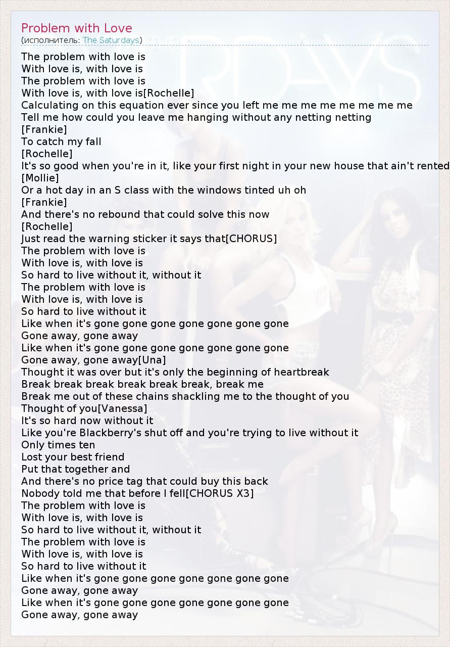 The problem with love is With love is, with love is The problem with love is With love is, with love is[Rochelle] Calculating on this equation ever since you left me me me me me me me me Tell me how could you leave me hanging without any netting netting [Frankie] To catch my fall [Rochelle] It's so good when you're in it, like your first night in your new house that ain't rented [Mollie] Or a hot day in an S class with the windows tinted uh oh [Frankie] And there's no rebound that could solve this now [Rochelle] Just read the warning sticker it says that[CHORUS] The problem with love is With love is, with love is So hard to live without it, without it The problem with love is With love is, with love is So hard to live without it Like when it's gone gone gone gone gone gone gone Gone away, gone away Like when it's gone gone gone gone gone gone gone Gone away, gone away[Una] Thought it was over but it's only the beginning of heartbreak Break break break break break break, break me Break me out of these chains shackling me to the thought of you Thought of you[Vanessa] It's so hard now without it Like you're Blackberry's shut off and you're trying to live without it Only times ten Lost your best friend Put that together and And there's no price tag that could buy this back Nobody told me that before I fell[CHORUS X3] The problem with love is With love is, with love is So hard to live without it, without it The problem with love is With love is, with love is So hard to live without it Like when it's gone gone gone gone gone gone gone Gone away, gone away Like when it's gone gone gone gone gone gone gone Gone away, gone away