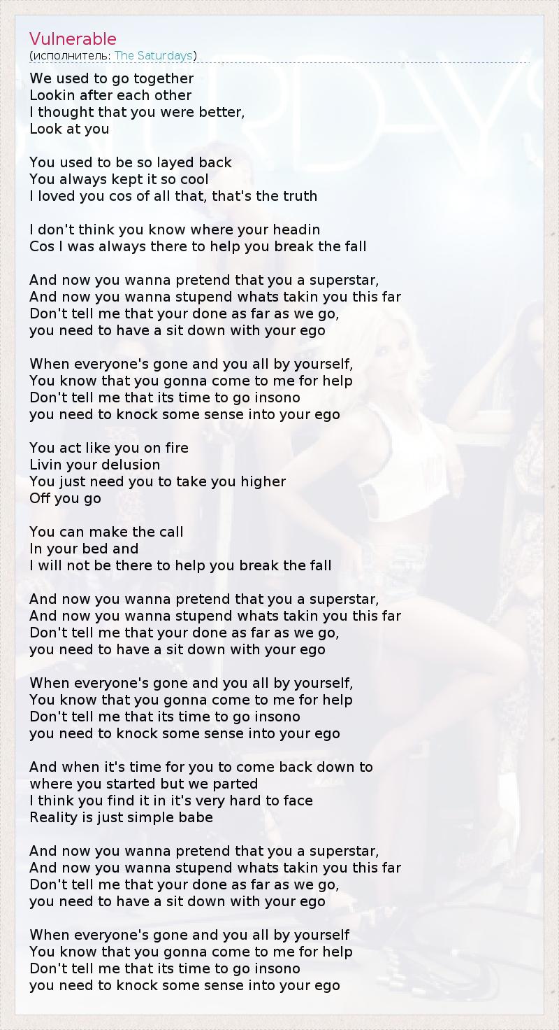 Обычно мы гуляли вместе, Заботились друг о друге, Я думала, ты лучше, чем ты есть, Глядя на тебя... Обычно ты был очень спокоен, Никогда не суетился, Я любила тебя за это, это правда Не думаю, что ты знаешь, куда идешь - Ведь я всегда была рядом и не давала тебе упасть... И теперь ты хочешь прикинуться суперзвездой, Теперь ты хочешь чуда, которое забросит тебя еще выше, Не говори мне, что у тебя все под контролем, Тебе нужно разобраться со своим эго Когда все ушли, и ты сам по себе, Ты знаешь, что придешь ко мне просить помощи, Не говори мне, что самое время понимать такой шум, Тебе пора привнести смысл в свое эго Ты действуешь как будто весь в огне, Живешь заблуждением, Что тебе нужно подняться еще выше, Чем ты сейчас Ты можешь названивать, Лежа в постели, Но меня не будет рядом, чтобы не дать тебе вляпаться в неприятности И теперь ты хочешь прикинуться суперзвездой, Теперь ты хочешь чуда, которое забросит тебя еще выше, Не говори мне, что у тебя все под контролем, Тебе нужно разобраться со своим эго Когда все ушли, и ты сам по себе, Ты знаешь, что придешь ко мне просить помощи, Не говори мне, что самое время понимать такой шум, Тебе пора привнести смысл в свое эго И когда придет твое время вернуться к тому, С чего ты начал, меня не будет рядом Я думаю, ты решил, что все очень сложно, Но реальность - это просто, малыш И теперь ты хочешь прикинуться суперзвездой, Теперь ты хочешь чуда, которое забросит тебя еще выше, Не говори мне, что у тебя все под контролем, Тебе нужно разобраться со своим эго Когда все ушли, и ты сам по себе, Ты знаешь, что придешь ко мне просить помощи, Не говори мне, что самое время понимать такой шум, Тебе пора привнести смысл в свое эго
