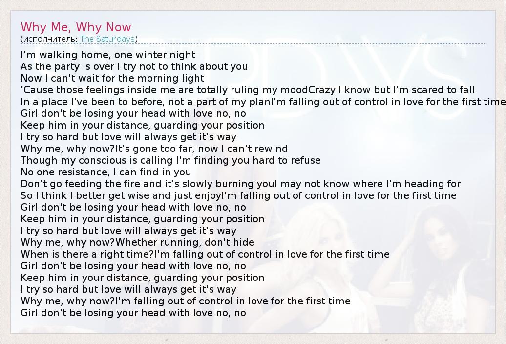 А как ты думаешь, о чем песня "Why Me, Why Now" ?