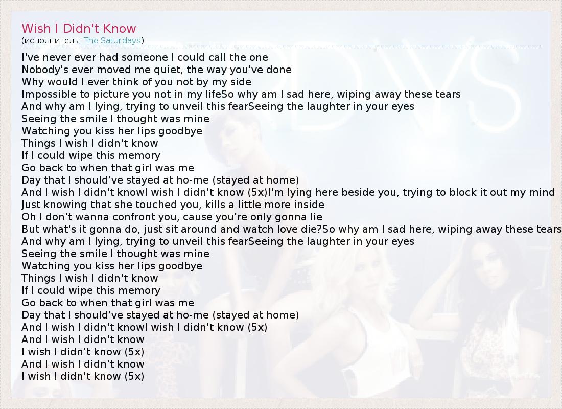 I've never ever had someone I could call the one Nobody's ever moved me quiet, the way you've done Why would I ever think of you not by my side Impossible to picture you not in my lifeSo why am I sad here, wiping away these tears And why am I lying, trying to unveil this fearSeeing the laughter in your eyes Seeing the smile I thought was mine Watching you kiss her lips goodbye Things I wish I didn't know If I could wipe this memory Go back to when that girl was me Day that I should've stayed at ho-me (stayed at home) And I wish I didn't knowI wish I didn't know (5x)I'm lying here beside you, trying to block it out my mind Just knowing that she touched you, kills a little more inside Oh I don't wanna confront you, cause you're only gonna lie But what's it gonna do, just sit around and watch love die?So why am I sad here, wiping away these tears And why am I lying, trying to unveil this fearSeeing the laughter in your eyes Seeing the smile I thought was mine Watching you kiss her lips goodbye Things I wish I didn't know If I could wipe this memory Go back to when that girl was me Day that I should've stayed at ho-me (stayed at home) And I wish I didn't knowI wish I didn't know (5x) And I wish I didn't know I wish I didn't know (5x) And I wish I didn't know I wish I didn't know (5x)