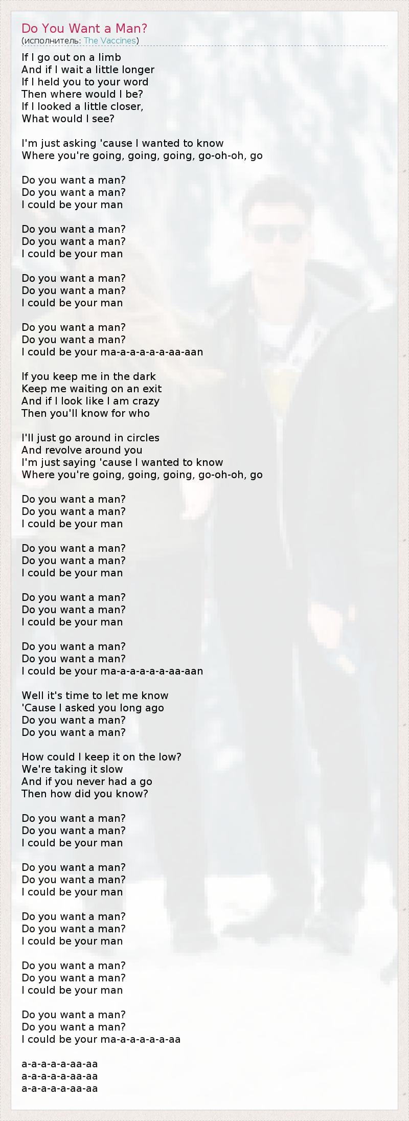If I go out on a limb And if I wait a little longer If I held you to your word Then where would I be? If I looked a little closer, What would I see? I'm just asking 'cause I wanted to know Where you're going, going, going, go-oh-oh, go Do you want a man? Do you want a man? I could be your man Do you want a man? Do you want a man? I could be your man Do you want a man? Do you want a man? I could be your man Do you want a man? Do you want a man? I could be your ma-a-a-a-a-a-aa-aan If you keep me in the dark Keep me waiting on an exit And if I look like I am crazy Then you'll know for who I'll just go around in circles And revolve around you I'm just saying 'cause I wanted to know Where you're going, going, going, go-oh-oh, go Do you want a man? Do you want a man? I could be your man Do you want a man? Do you want a man? I could be your man Do you want a man? Do you want a man? I could be your man Do you want a man? Do you want a man? I could be your ma-a-a-a-a-a-aa-aan Well it's time to let me know 'Cause I asked you long ago Do you want a man? Do you want a man? How could I keep it on the low? We're taking it slow And if you never had a go Then how did you know? Do you want a man? Do you want a man? I could be your man Do you want a man? Do you want a man? I could be your man Do you want a man? Do you want a man? I could be your man Do you want a man? Do you want a man? I could be your man Do you want a man? Do you want a man? I could be your ma-a-a-a-a-a-aa a-a-a-a-a-aa-aa a-a-a-a-a-aa-aa a-a-a-a-a-aa-aa