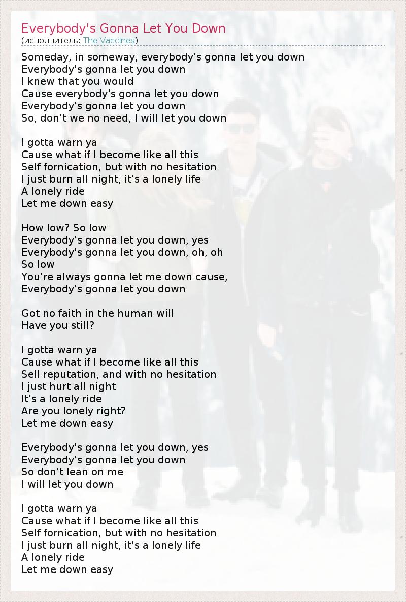 Someday, in someway, everybody's gonna let you down Everybody's gonna let you down I knew that you would Cause everybody's gonna let you down Everybody's gonna let you down So, don't we no need, I will let you down I gotta warn ya Cause what if I become like all this Self fornication, but with no hesitation I just burn all night, it's a lonely life A lonely ride Let me down easy How low? So low Everybody's gonna let you down, yes Everybody's gonna let you down, oh, oh So low You're always gonna let me down cause, Everybody's gonna let you down Got no faith in the human will Have you still? I gotta warn ya Cause what if I become like all this Sell reputation, and with no hesitation I just hurt all night It's a lonely ride Are you lonely right? Let me down easy Everybody's gonna let you down, yes Everybody's gonna let you down So don't lean on me I will let you down I gotta warn ya Cause what if I become like all this Self fornication, but with no hesitation I just burn all night, it's a lonely life A lonely ride Let me down easy