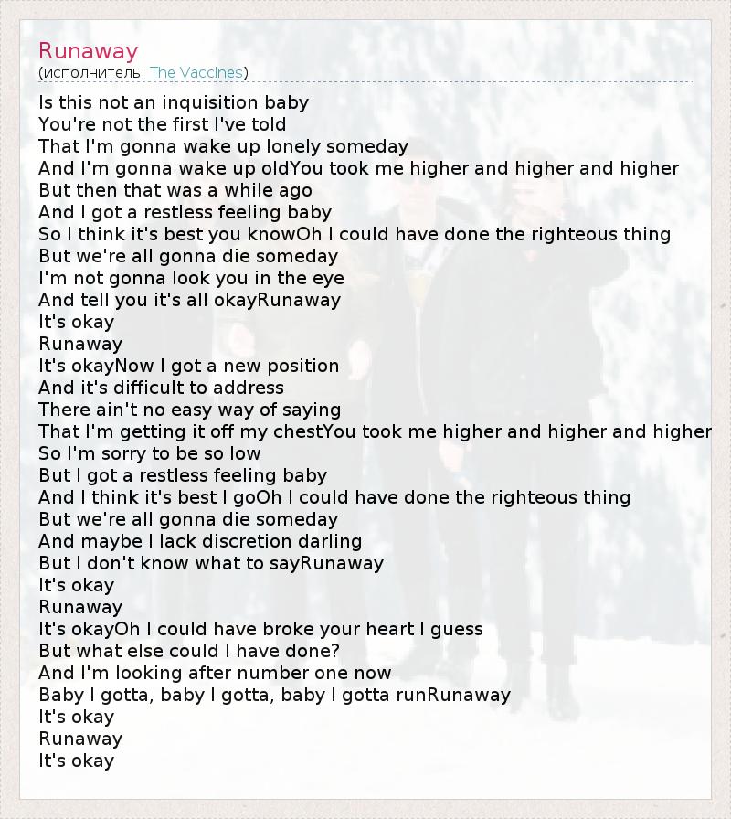 Is this not an inquisition baby You're not the first I've told That I'm gonna wake up lonely someday And I'm gonna wake up oldYou took me higher and higher and higher But then that was a while ago And I got a restless feeling baby So I think it's best you knowOh I could have done the righteous thing But we're all gonna die someday I'm not gonna look you in the eye And tell you it's all okayRunaway It's okay Runaway It's okayNow I got a new position And it's difficult to address There ain't no easy way of saying That I'm getting it off my chestYou took me higher and higher and higher So I'm sorry to be so low But I got a restless feeling baby And I think it's best I goOh I could have done the righteous thing But we're all gonna die someday And maybe I lack discretion darling But I don't know what to sayRunaway It's okay Runaway It's okayOh I could have broke your heart I guess But what else could I have done? And I'm looking after number one now Baby I gotta, baby I gotta, baby I gotta runRunaway It's okay Runaway It's okay