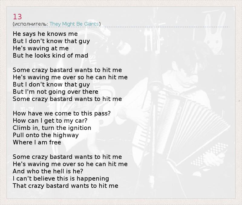 He says he knows me But I don't know that guy He's waving at me But he looks kind of mad Some crazy bastard wants to hit me He's waving me over so he can hit me But I don't know that guy But I'm not going over there Some crazy bastard wants to hit me How have we come to this pass? How can I get to my car? Climb in, turn the ignition Pull onto the highway Where I am free Some crazy bastard wants to hit me He's waving me over so he can hit me And who the hell is he? I can't believe this is happening That crazy bastard wants to hit me