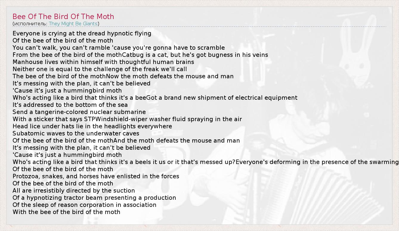 Everyone is crying at the dread hypnotic flying Of the bee of the bird of the moth You can't walk, you can't ramble 'cause you're gonna have to scramble From the bee of the bird of the mothCatbug is a cat, but he's got bugness in his veins Manhouse lives within himself with thoughtful human brains Neither one is equal to the challenge of the freak we'll call The bee of the bird of the mothNow the moth defeats the mouse and man It's messing with the plan, it can't be believed 'Cause it's just a hummingbird moth Who's acting like a bird that thinks it's a beeGot a brand new shipment of electrical equipment It's addressed to the bottom of the sea Send a tangerine-colored nuclear submarine With a sticker that says STPWindshield-wiper washer fluid spraying in the air Head lice under hats lie in the headlights everywhere Subatomic waves to the underwater caves Of the bee of the bird of the mothAnd the moth defeats the mouse and man It's messing with the plan, it can't be believed 'Cause it's just a hummingbird moth Who's acting like a bird that thinks it's a beeIs it us or it that's messed up?Everyone's deforming in the presence of the swarming Of the bee of the bird of the moth Protozoa, snakes, and horses have enlisted in the forces Of the bee of the bird of the moth All are irresistibly directed by the suction Of a hypnotizing tractor beam presenting a production Of the sleep of reason corporation in association With the bee of the bird of the moth