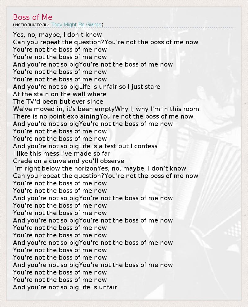 Yes, no, maybe, I don't know Can you repeat the question?You're not the boss of me now You're not the boss of me now You're not the boss of me now And you're not so bigYou're not the boss of me now You're not the boss of me now You're not the boss of me now And you're not so bigLife is unfair so I just stare At the stain on the wall where The TV'd been but ever since We've moved in, it's been emptyWhy I, why I'm in this room There is no point explainingYou're not the boss of me now And you're not so bigYou're not the boss of me now You're not the boss of me now You're not the boss of me now And you're not so bigLife is a test but I confess I like this mess I've made so far Grade on a curve and you'll observe I'm right below the horizonYes, no, maybe, I don't know Can you repeat the question?You're not the boss of me now You're not the boss of me now You're not the boss of me now And you're not so bigYou're not the boss of me now You're not the boss of me now You're not the boss of me now And you're not so bigYou're not the boss of me now You're not the boss of me now You're not the boss of me now And you're not so bigYou're not the boss of me now You're not the boss of me now You're not the boss of me now And you're not so bigYou're not the boss of me now You're not the boss of me now You're not the boss of me now And you're not so bigLife is unfair