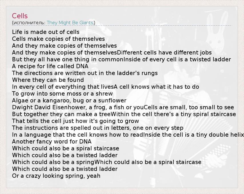 Life is made out of cells Cells make copies of themselves And they make copies of themselves And they make copies of themselvesDifferent cells have different jobs But they all have one thing in commonInside of every cell is a twisted ladder A recipe for life called DNA The directions are written out in the ladder's rungs Where they can be found In every cell of everything that livesA cell knows what it has to do To grow into some moss or a shrew Algae or a kangaroo, bug or a sunflower Dwight David Eisenhower, a frog, a fish or youCells are small, too small to see But together they can make a treeWithin the cell there's a tiny spiral staircase That tells the cell just how it's going to grow The instructions are spelled out in letters, one on every step In a language that the cell knows how to readInside the cell is a tiny double helix Another fancy word for DNA Which could also be a spiral staircase Which could also be a twisted ladder Which could also be a springWhich could also be a spiral staircase Which could also be a twisted ladder Or a crazy looking spring, yeah
