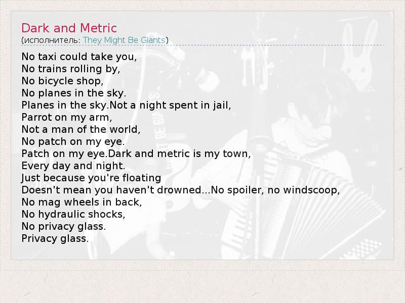 А как ты думаешь, о чем песня "Dark and Metric" ?