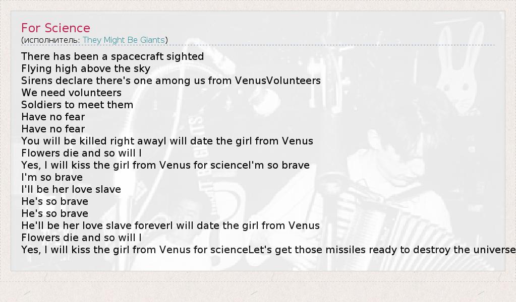 Yes, I will kiss the girl from Venus for scienceLet's get those missiles ready to destroy the universe