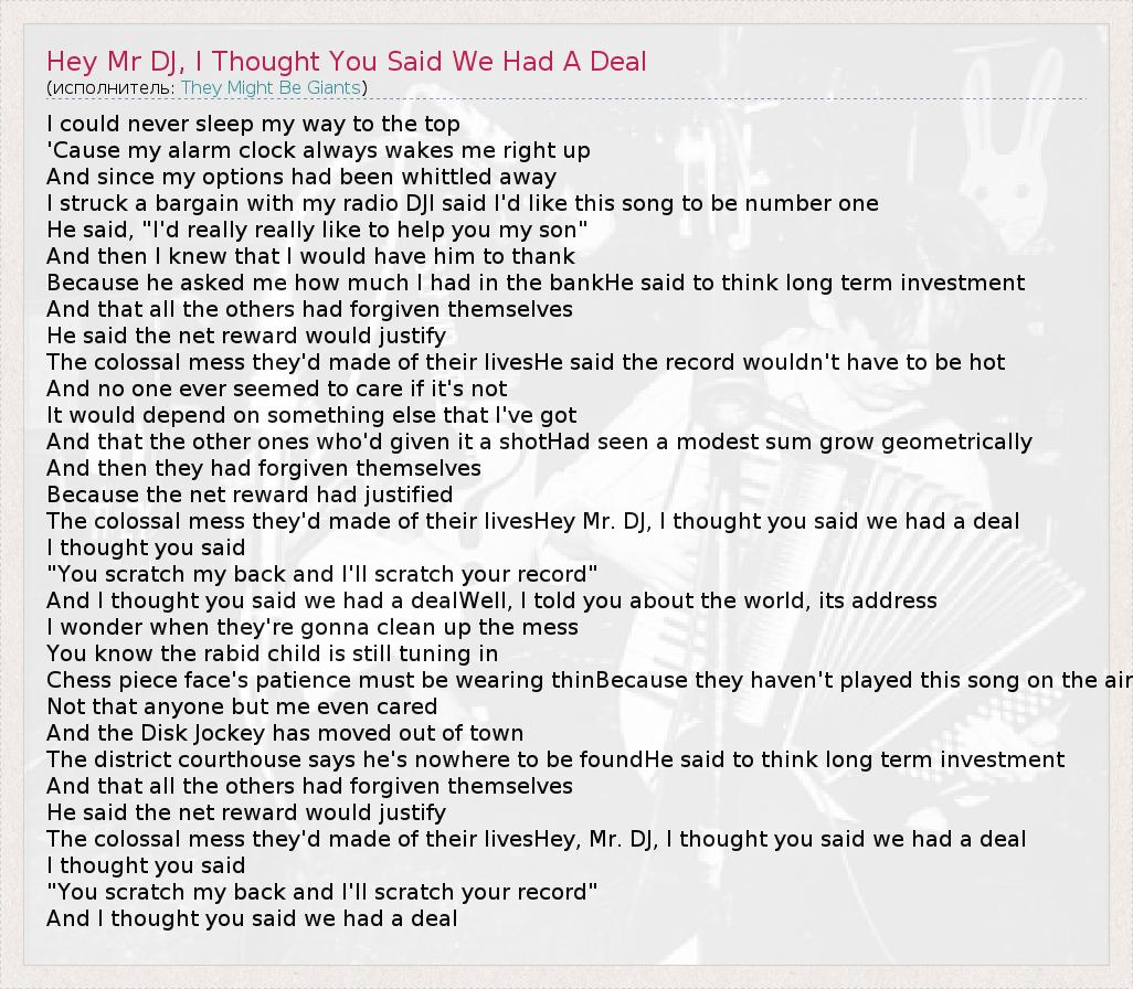 А как ты думаешь, о чем песня "Hey Mr DJ, I Thought You Said We Had A Deal" ?