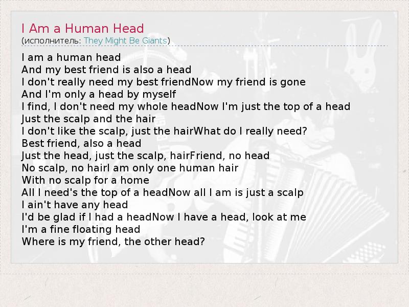 А как ты думаешь, о чем песня "I Am a Human Head" ?